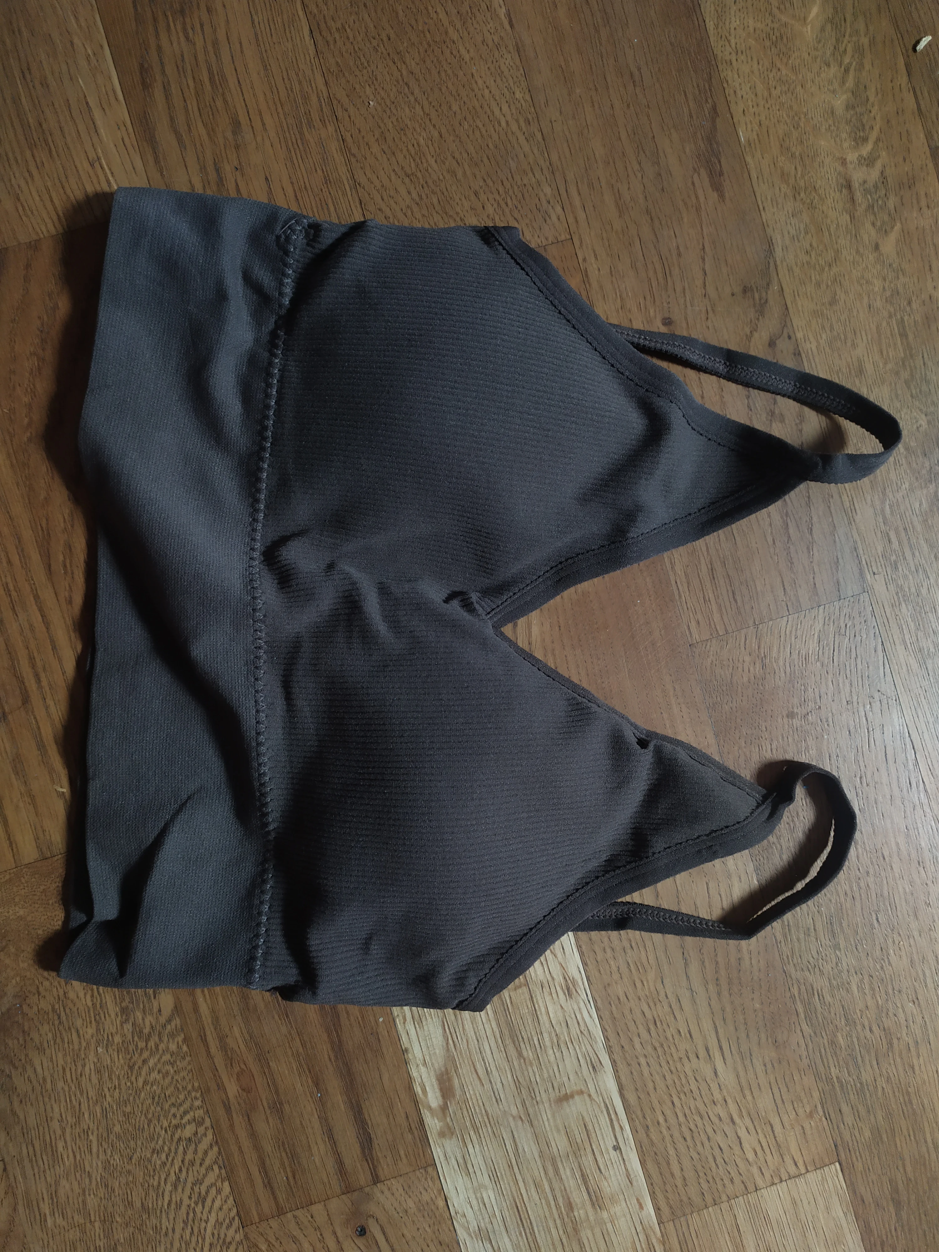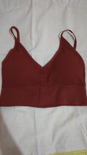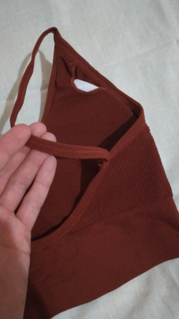Очень приятный материал к телу. Топ сел идеально На объем груди 86, есть вкладыши, отдельные для каждой груди, с лёгким пушапом. Есть небольшой запах, думаю, после стирки исчезнет. Качество пошива идеальное, нет ниток, ровные строчки. Цвет рыжекоричневый, как жженая карамель. Взяла к топу трусики стринги у этого продавца, в этом же цвете, но увы, они другого оттенка, холодного, расстроилась... Спинка открытая, низкая Беретели не регулируются.