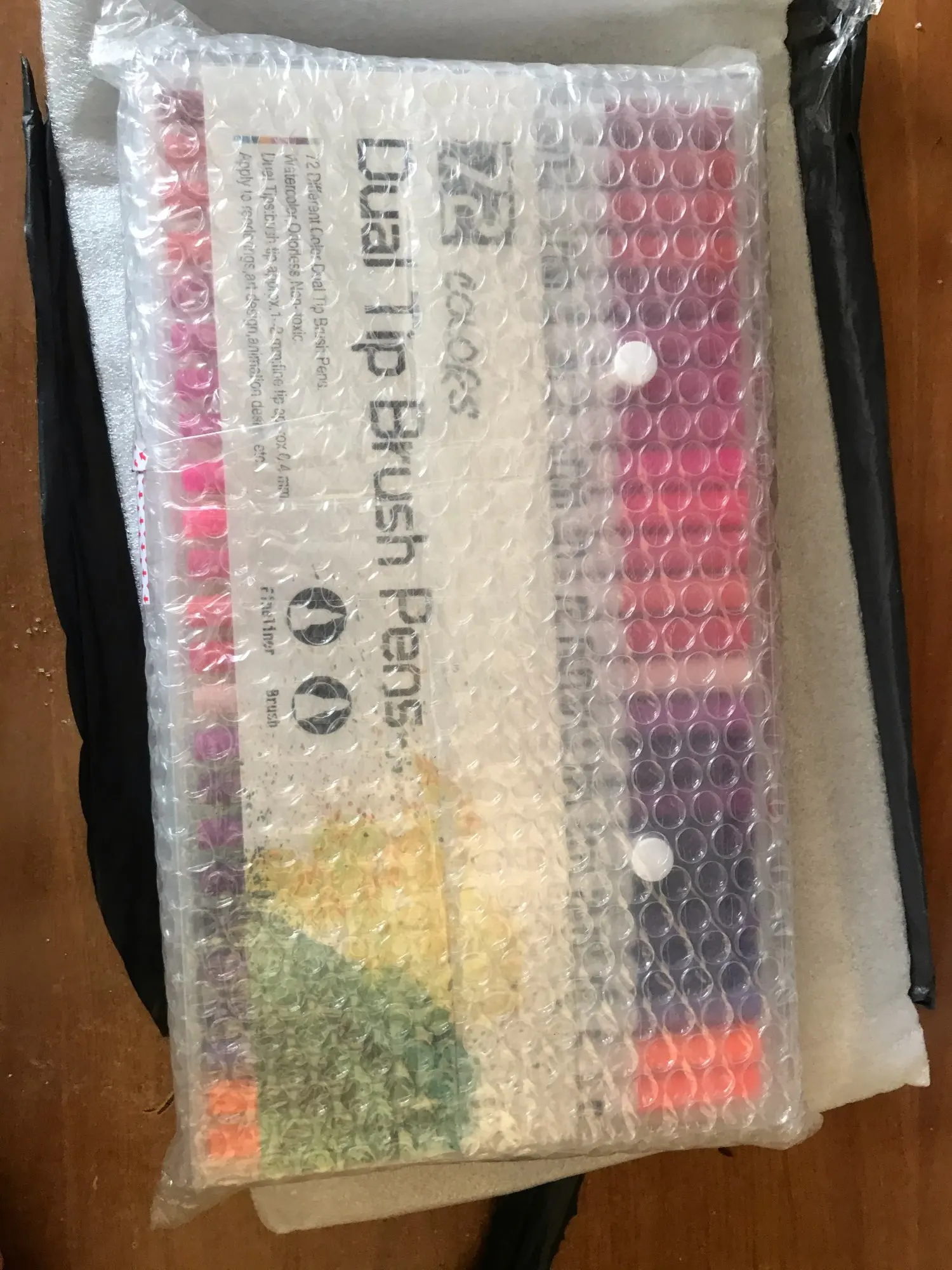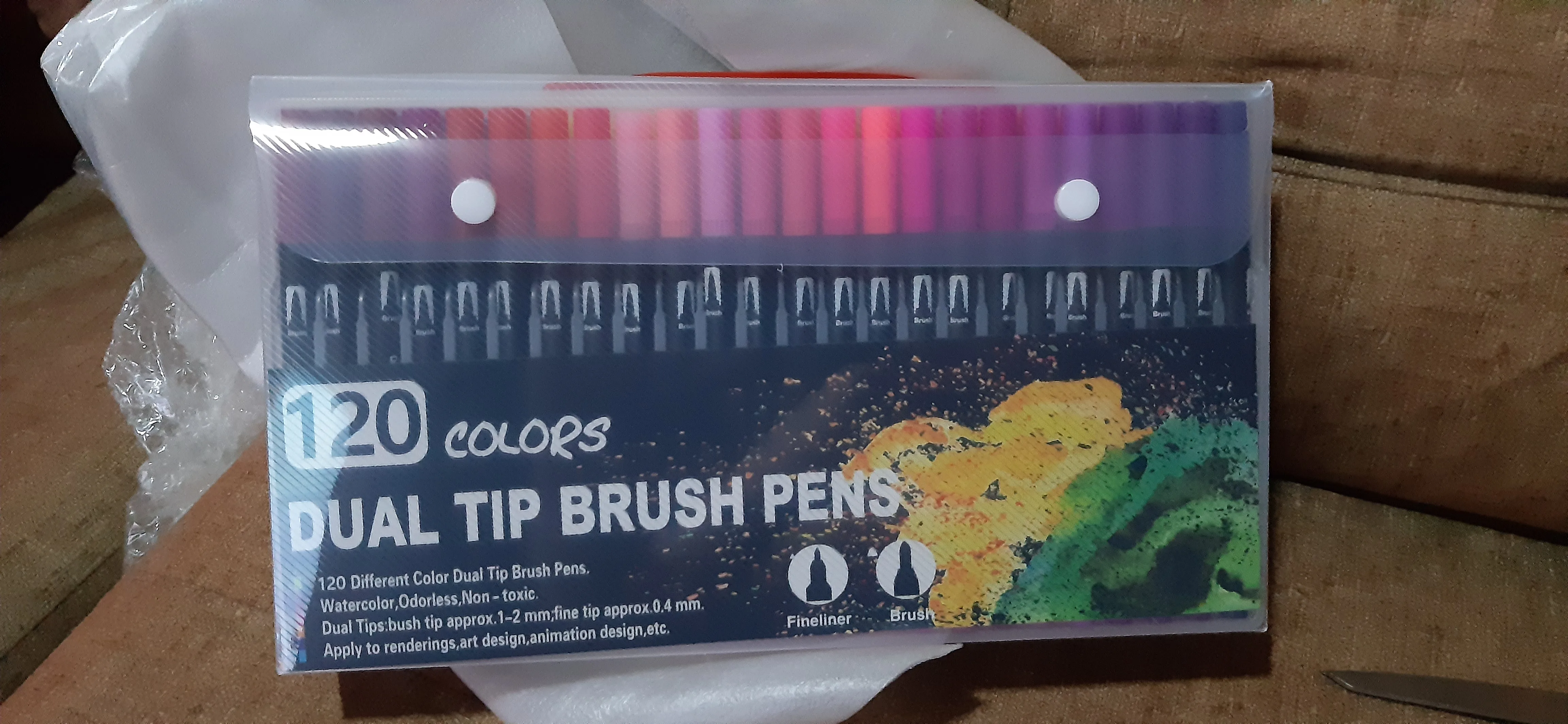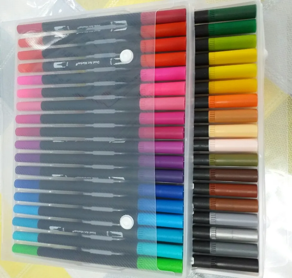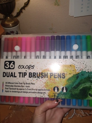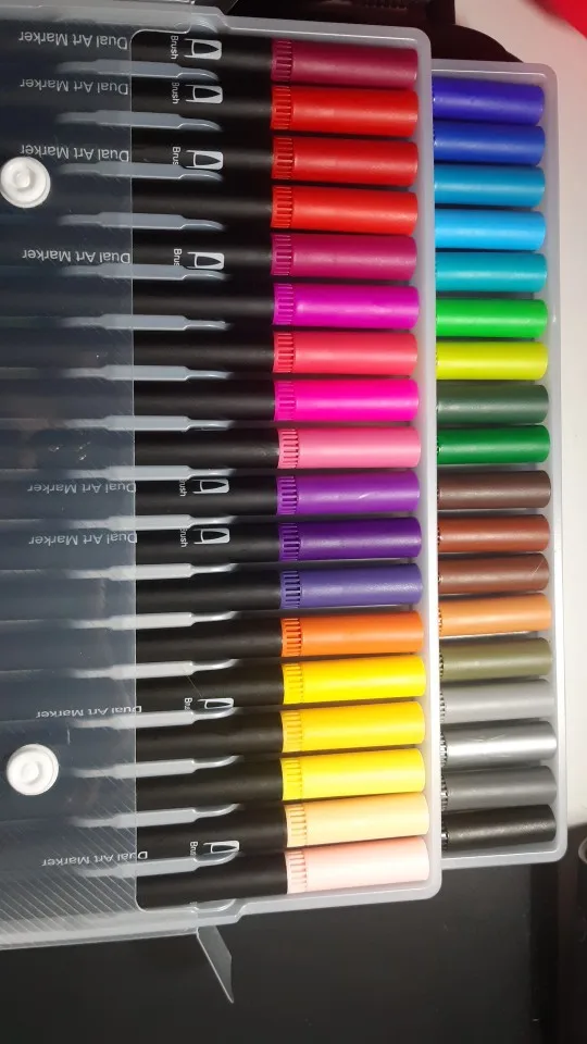 Заказ пришел через 3 недели. Хорошо упаковано. Все хорошо. Как и наконечник кисти, более гладкий, чем тонкий наконечник, который очень жесткий и трудно писать. Их рекламные фотографии немного обманчивы, они по-прежнему в конце дня только маркеры, нельзя использовать как цвет на водной основе, как на фото. Тем не менее, по такой цене, я очень рад иметь эти маркеры, чтобы играть! Спасибо.