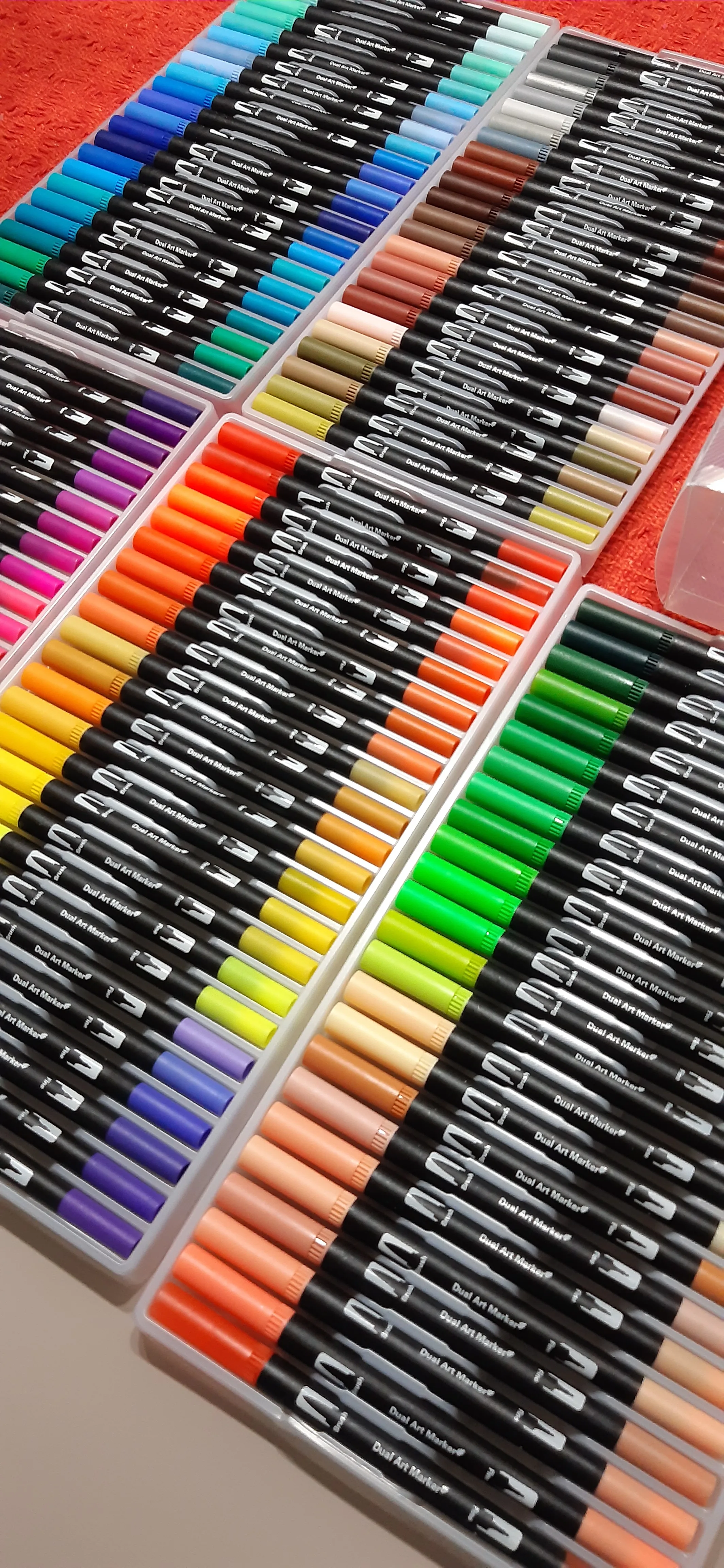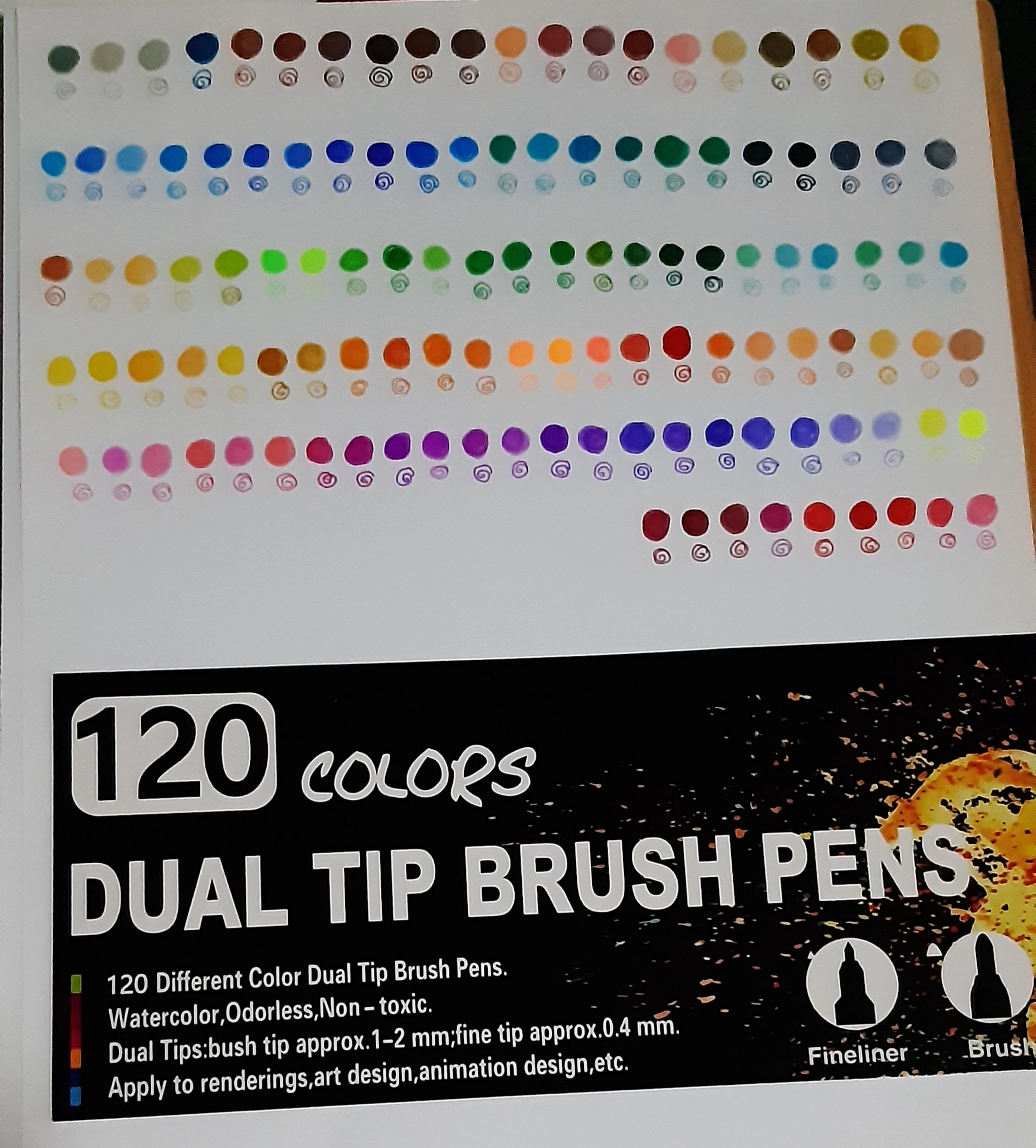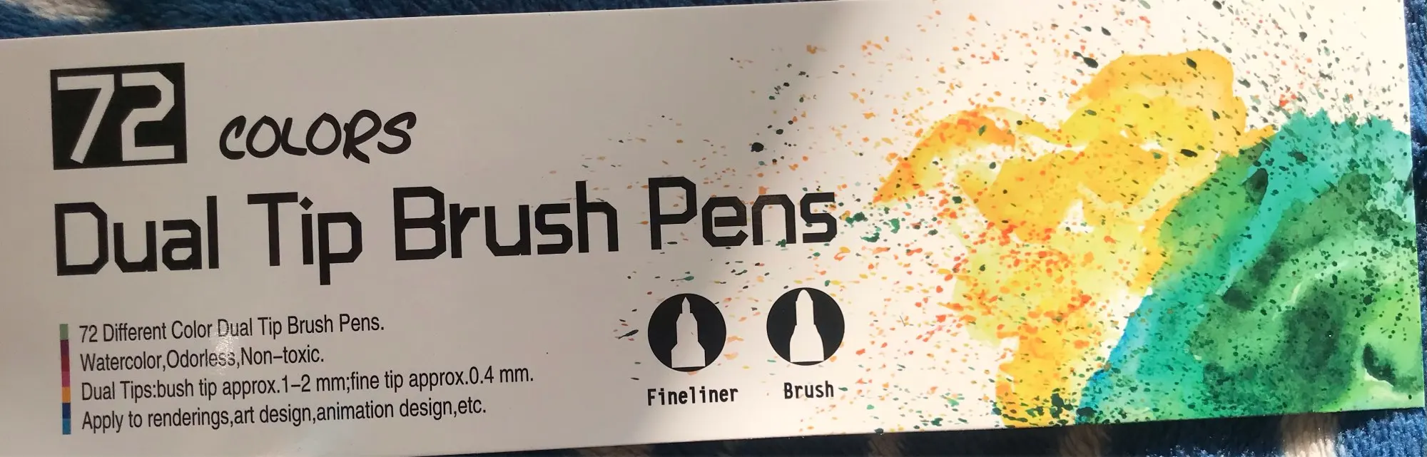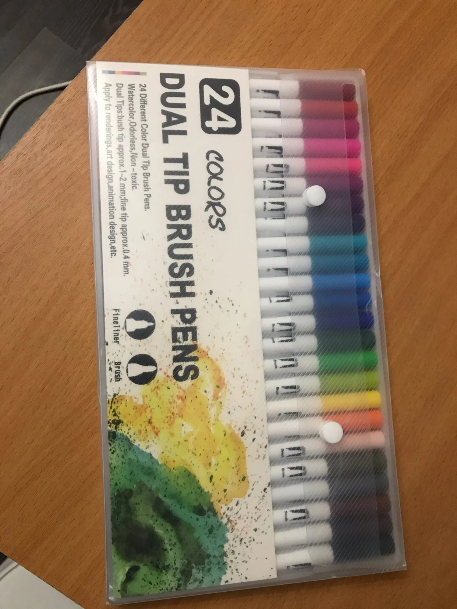 Заказ пришел через 3 недели. Хорошо упаковано. Все хорошо. Как и наконечник кисти, более гладкий, чем тонкий наконечник, который очень жесткий и трудно писать. Их рекламные фотографии немного обманчивы, они по-прежнему в конце дня только маркеры, нельзя использовать как цвет на водной основе, как на фото. Тем не менее, по такой цене, я очень рад иметь эти маркеры, чтобы играть! Спасибо.