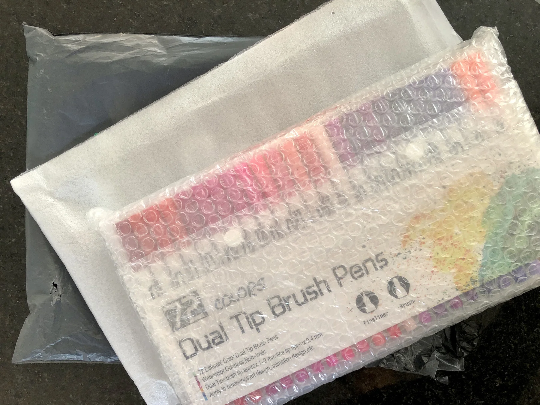 Я очень огорчена. Единственный плюс, посылка пришла осень хорошо упакована, на фото видно, заказывала акварельные фломастеры, в описании так написано, но пришли обычные фломастеры и они совсем не похожи на акварельные, будте внимательны!!!!! Был бесплатный возврат, но я побоялась, что затеряется в дороге посылка и я не получу обратно деньги и отправлять не стала, оставила ребёнку с ними ходить в художественную школу. Буду делать ещё раз заказ, но уже у другого продавца и именно акварельные фломастеры!