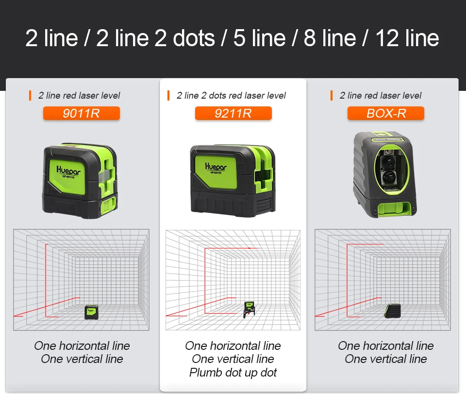 После включения, короткое нажатие выключатель питания один раз в раз, лазерный инструмент будет проектировать горизонтальные линии, вертикальные линии и поперечные линии в свою очередь.