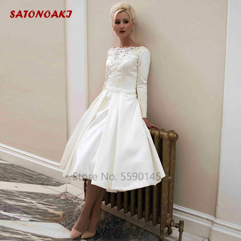 Женское свадебное платье с кружевной аппликацией, простое короткое платье-трапеция до середины икры с длинным рукавом, 2022