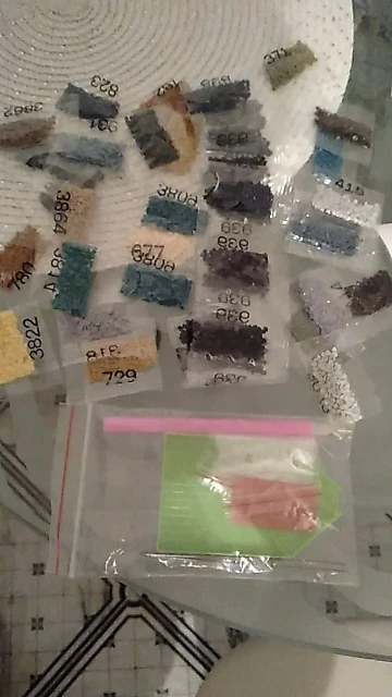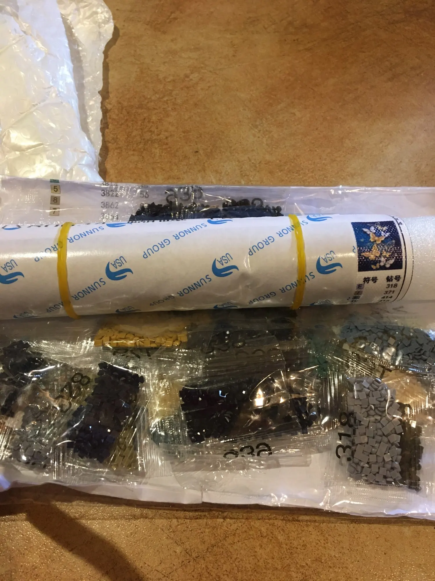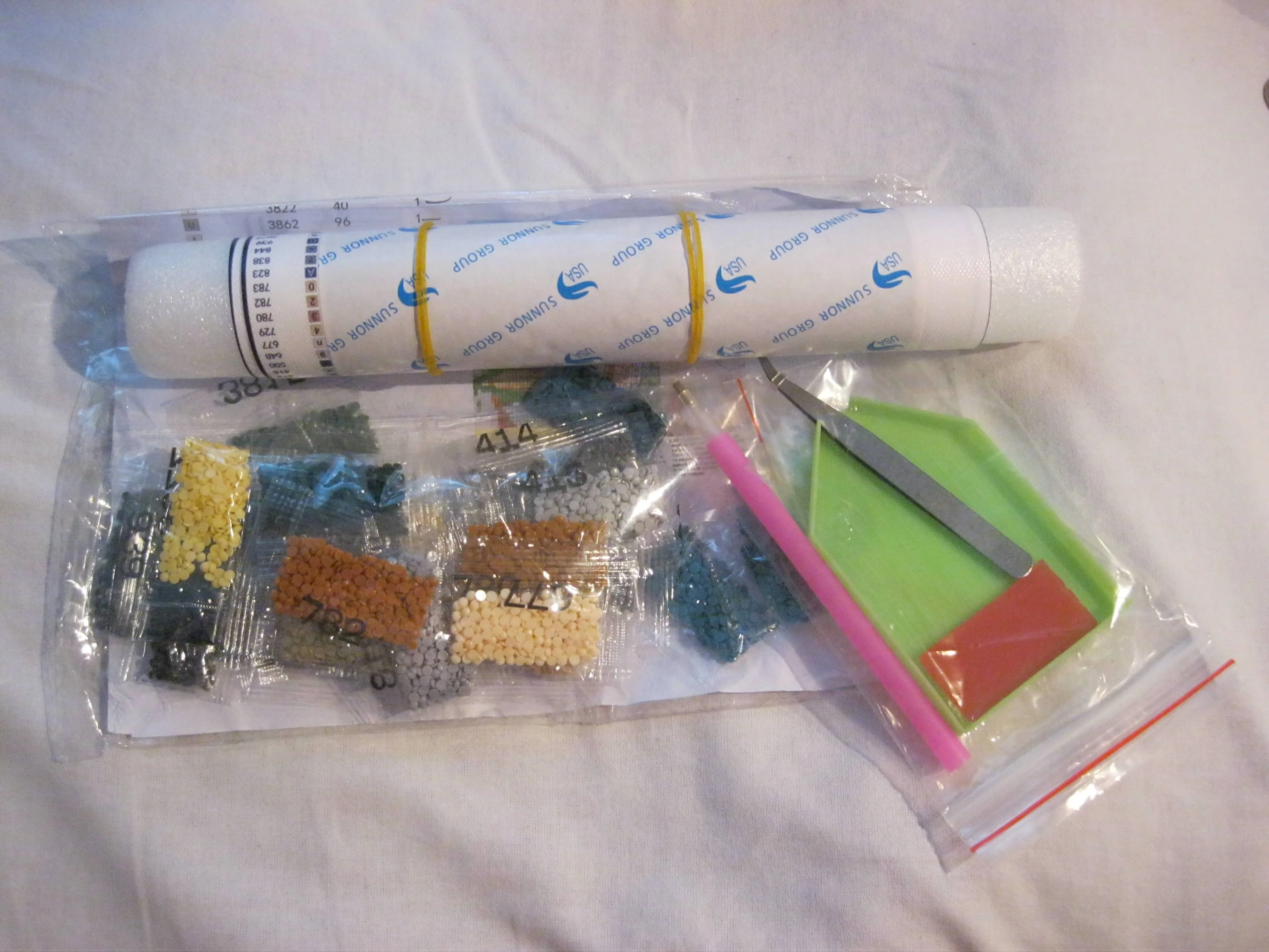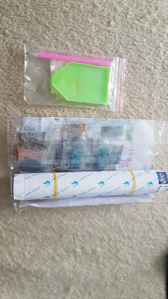Выиграла за монетки самый маленький размер. Поговорив с продавцом, за доплату поменяла на чуть больший размер - решила первый раз попробовать круглые стразы. Сама картина намотана на валик, но почему-то всё равно есть заломы. Стразики в обычных одноразовых пакетиках- это очень неудобно, так как теперь надо потратить время, чтобы пересыпать их в зип пакетики и каждый подписать. Лоток для стразиков какой-то слишком тоненький. Осталось найти время и выложить картину)