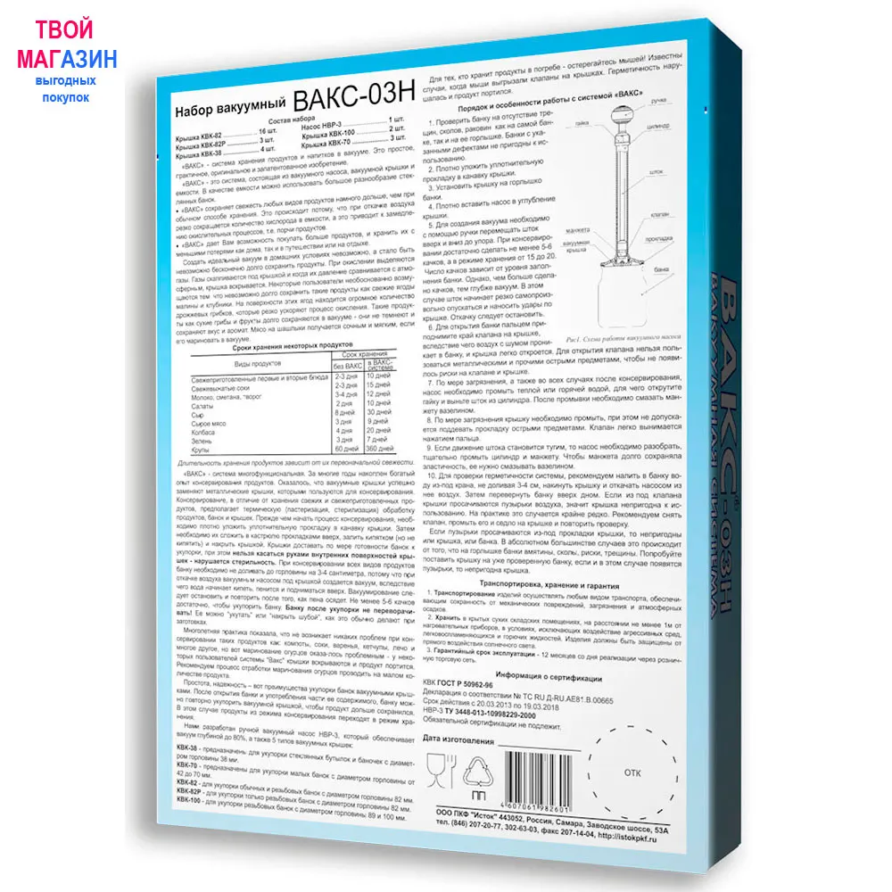 В состав набора ВАКС-03Н входят крышки КВК-82 (желтые, красные и зеленые) - 16 шт, КВК-82Р - 3 шт, КВК-100 - 2 шт, КВК-70 - 3 шт, КВК-38 - 4 шт и насос НВР-3 - 1 шт.Устройство вакуумного консервирования ВАКС - это система, состоящая из вакуумного насоса, вакуумной крышки и емкости (банки, бутылки, контейнера).Вакуумная система ВАКС®- предназначена для многоразовой вакуумной укупорки стеклянных банок с целью:длительного консервирования овощей, фруктов, ягод, соков и т.д.временного хранения в вакууме свежих и свежеприготовленных продуктов.Под влиянием кислорода мясо окисляется и темнеет, жир быстро портится и выделяет токсины. Рыба портится еще быстрее. Вакуум поможет Вам сохранить эти продукты в 3 раза дольше!При обычном хранении сыр теряет большое количество протеинов, прокисает и начинает плесневеть. Овощи быстро портятся и теряют большое количество витаминов. Вакуум увеличит срок хранения этих продуктов в несколько раз.Процессы разложения в приготовленной пище часто идут незаметно, что может отразиться на здоровье. Вакуумная система “ВАКС” поможет избежать таких последствий. Вакуум помогает дольше сохранить великолепный вкус и свежесть свежеприготовленных соков, протертых овощей, свежего молока, молочных продуктов и т.д.Влажность провоцирует появление плесени на хлебе и печенье. Вакуум помогает сохранить их вкус и свежесть, а такие продукты как сухофрукты, мука и крупы станут недоступными для жучков. Кофе и чай продаются в вакуумной упаковке, использование в дальнейшем системы “ВАКС” позволит Вам сохранить их вкус и аромат.Ниже приведена сводная таблица, в которой указаны сроки хранения в обычных условиях и в вакууме: