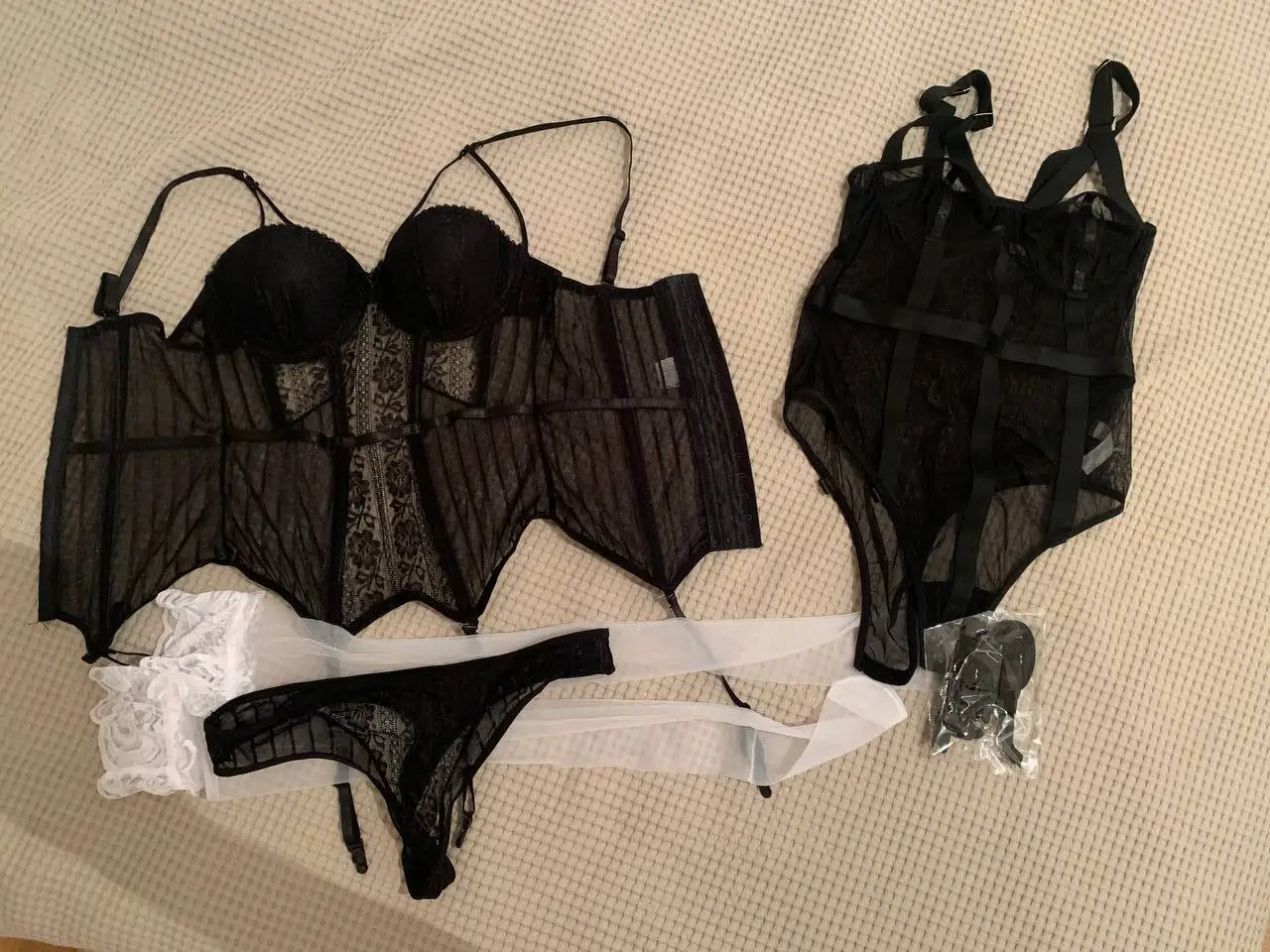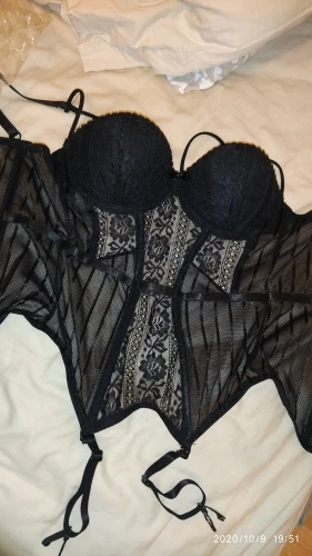 Классный комплект, но сильно маломерит. Обычно ношу XS а тут М в притык сел. Мои параметры ОГ 84 , ОТ 65, ОБ 89, выглядит секси, но корсет застегнула на последнии крючки. Чулки полная хрень, идут без резинки и ноги перетягивают как сардельки, сразу выкинула.