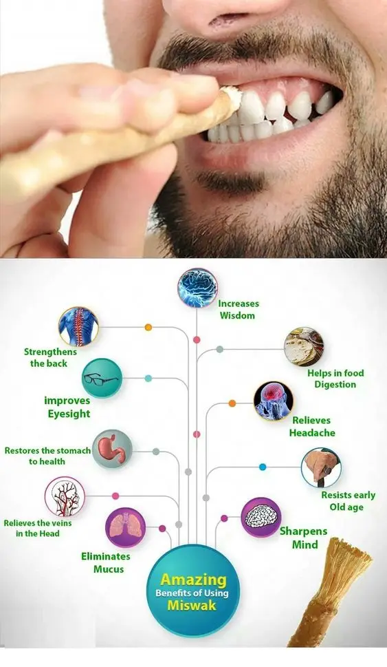 Мисвак вырезан из ветки сливового дерева и готов к использованию. Ее невероятные преимущества для человеческого организма были научно доказаны. Он имеет тонкие волокна и имеет уникальный запах. В некоторых исследованиях утверждалось, что Мишель обладает антиоксидантным, анальгетическим и противовоспалительным действием. Использование miswak немедленно влияет на состав слюны. Некоторые клинические исследования подтвердили, что эффективность механической и химической чистки жевательных стержней miswak имеет равное и большее влияние, чем у зубной щетки.