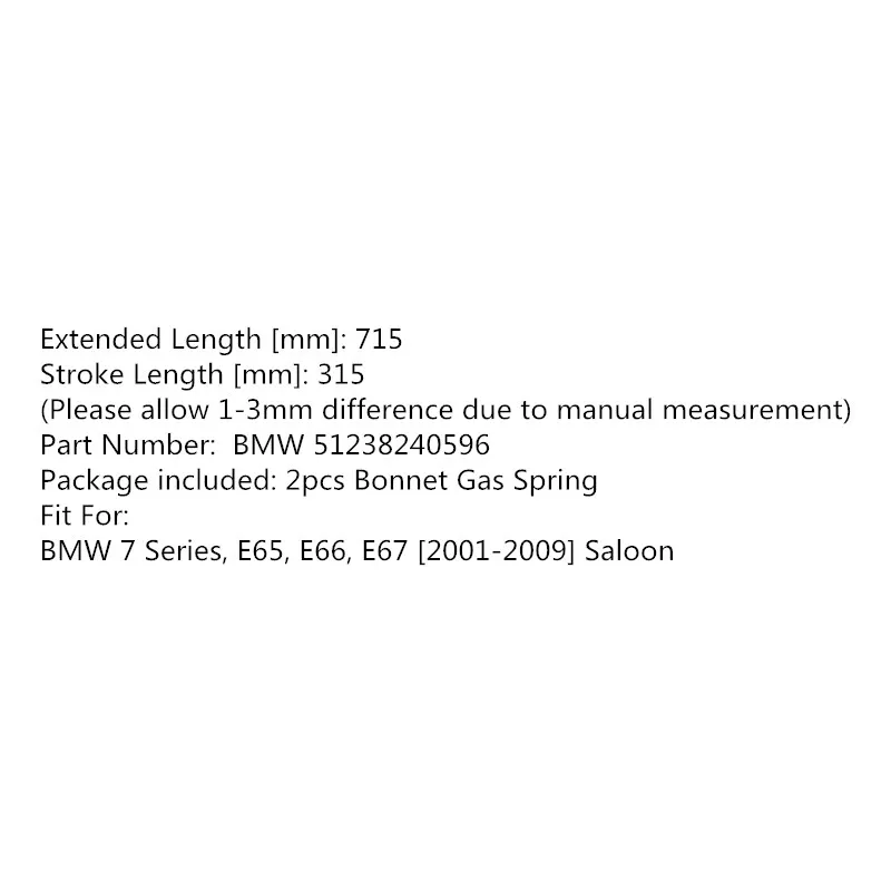 Удлиненная Длина [мм]: 715 Длина хода [мм]: 315 (Замеры сделаны вручную, поэтому возможны отклонения на 1-3 мм) Номер детали: BMW 51238240596 Посылка включает в себя: 2 шт. газовая пружина капота Подходит для: