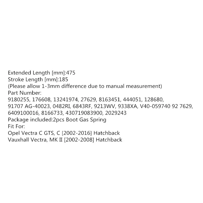 Удлиненная Длина [мм]:475Длина хода [мм]:185 (Замеры сделаны вручную, поэтому возможны отклонения на 1-3 мм) Номер детали: 9180255, 176608, 13241974, 27629, 8163451, 444051, 128680 AG-91707, 0482RI, 6843RF, 9213WV, 9338XA, V40-059740 92 40023, 7629, 6409100016, 8166733, 430719083900, 2029243 Посылка включает в себя: 2 шт. газовая пружина Подходит для: