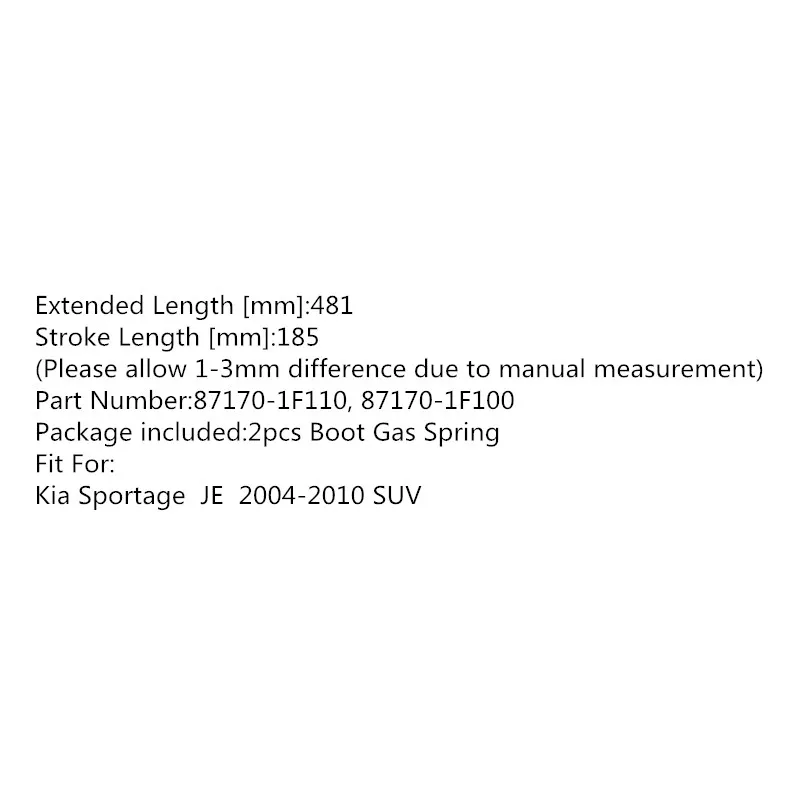 Удлиненная Длина [мм]:481Длина хода [мм]:185(Замеры сделаны вручную, поэтому возможны отклонения на 1-3 мм) Номер детали:87170-1F110, 87170-1F100 Посылка включает в себя:2 шт. газовая пружина для ботинок Подходит для:Kia Sportage JE 2004-2010 внедорожникХарактеристика: Один год гарантии качества Специальный герметичный Направляющий Блок останавливает протекание под высоким давлением. Вогнутое уплотнение предотвращает утечку масла. Стальной круглый диск на спине для прочности. Цилиндр изготовлен из бесшовной стальной трубы. Высокая точность шлифовки. Длительный срок службы. Детали поршня для самостоятельной очистки обеспечивают плавную работу и стабильную производительность. Легко устанавливается с помощью простых ручных инструментов. Оплата: Мы принимаем Paypal и другие основные кредитные карты через Paypal для оплаты. Доставка: Мы отправляем нашу продукцию выбранным способом доставки в течение 4 дней. Отзывы: Если товар неисправен, пожалуйста, сообщите нам, прежде чем оставить отрицательный отзывы, мы предоставим вам удовлетворительное решение. Ваши положительные отзывы будут высоко оценены. Свяжитесь с нами: При возникновении любых вопросов во время покупок в нашем магазине, пожалуйста, свяжитесь с нами.