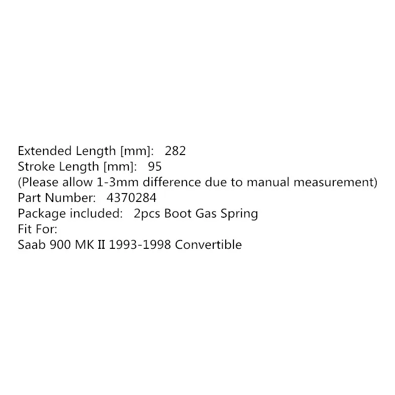 Удлиненная Длина [мм]: 282 Длина хода [мм]: 95 (Замеры сделаны вручную, поэтому возможны отклонения на 1-3 мм) Номер детали:4370284 Посылка включает в себя:2 шт. газовая пружина для ботинок Подходит для:Saab 900 MK II 1993-1998 кабриолет Характеристика: Один год гарантии качества Специальный герметичный Направляющий Блок останавливает протекание под высоким давлением. Вогнутое уплотнение предотвращает утечку масла. Стальной круглый диск на спине для прочности. Цилиндр изготовлен из бесшовной стальной трубы. Высокая точность шлифовки. Длительный срок службы. Детали поршня для самостоятельной очистки обеспечивают плавную работу и стабильную производительность. Легко устанавливается с помощью простых ручных инструментов. Оплата: Мы принимаем Paypal и другие основные кредитные карты через Paypal для оплаты. Доставка: Мы отправляем нашу продукцию выбранным способом доставки в течение 4 дней. Отзывы: Если товар неисправен, пожалуйста, сообщите нам, прежде чем оставить отрицательный отзывы, мы предоставим вам удовлетворительное решение. Ваши положительные отзывы будут высоко оценены. Свяжитесь с нами: При возникновении любых вопросов во время покупок в нашем магазине, пожалуйста, свяжитесь с нами.