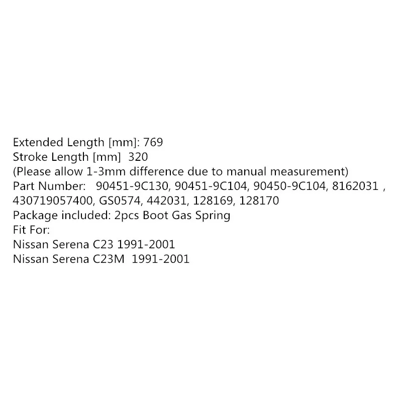 Удлиненная Длина [мм]:769 Длина хода [мм] 320 (Замеры сделаны вручную, поэтому возможны отклонения на 1-3 мм) Номер детали:90451-9C130, 90451-9C104, 90450-9C104, 8162031,430719057400, GS0574, 442031, 128169, 128170 Посылка включает в себя:2 шт. газовая пружина для ботинок Подходит для: