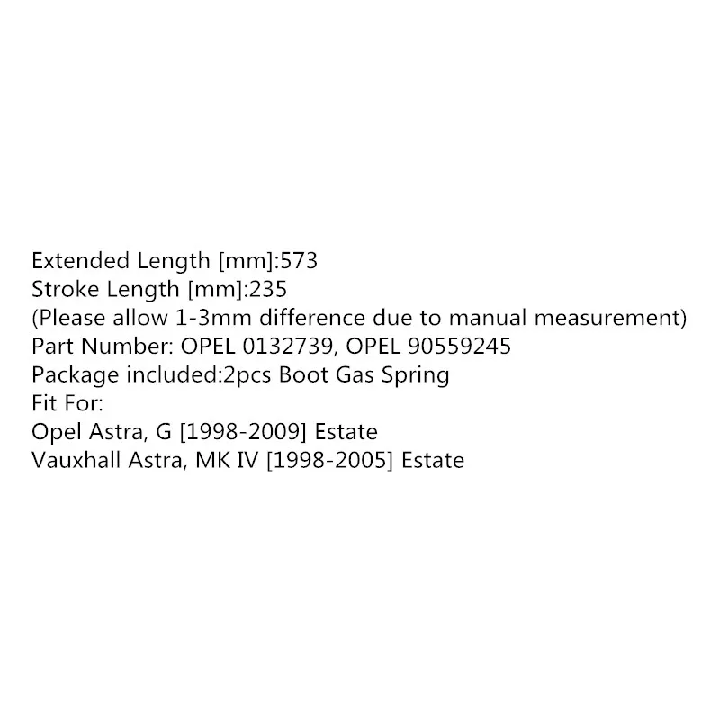 Удлиненная Длина [мм]:573Длина хода [мм]:235 (Замеры сделаны вручную, поэтому возможны отклонения на 1-3 мм) Номер детали:OPEL 0132739, OPEL 90559245 Посылка включает в себя: 2 шт. газовая пружина Подходит для: