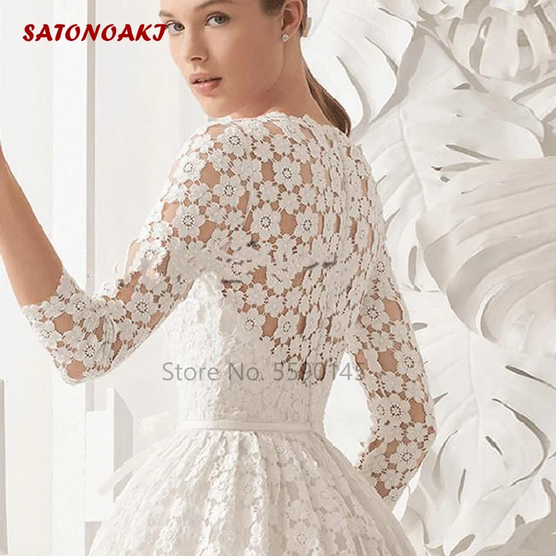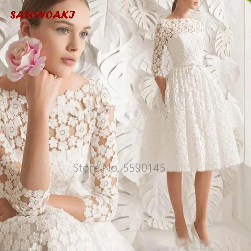 2021 Короткое свадебное платье A до силуэт Иллюзия 3 4 рукав кружев...