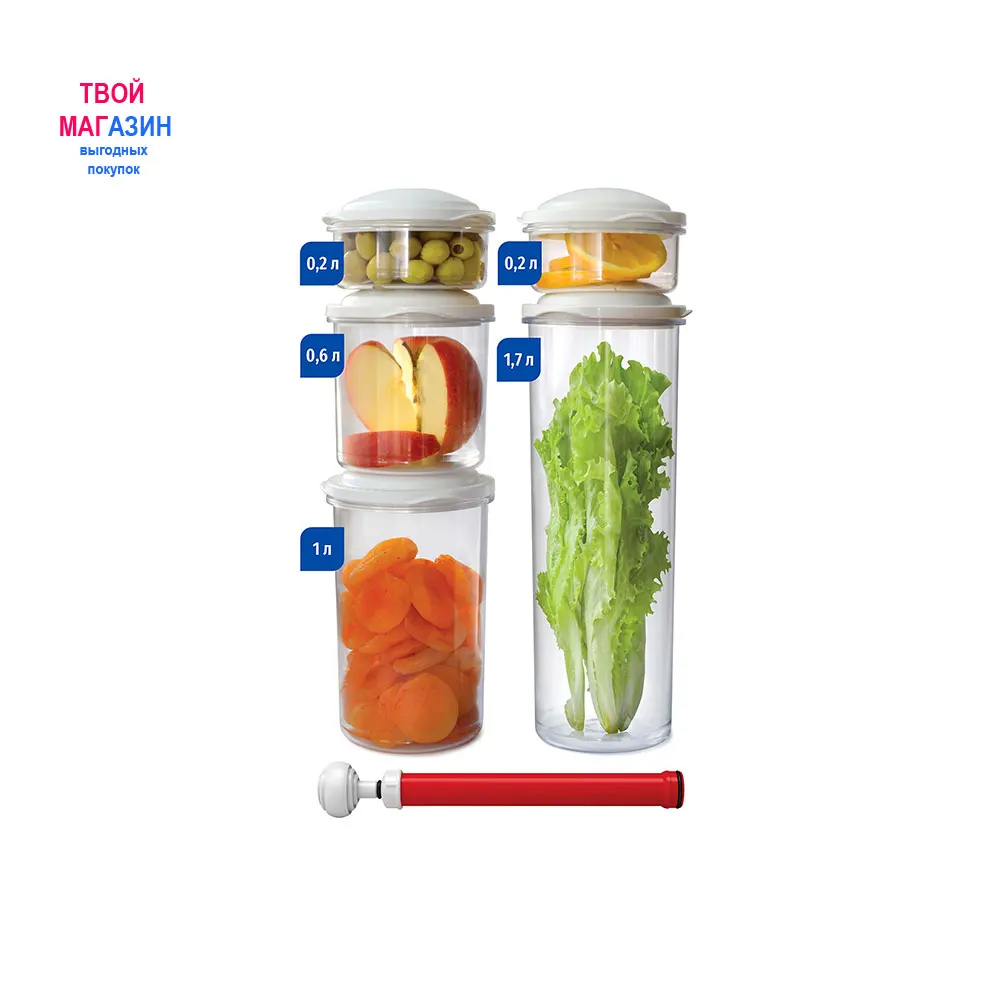 Вакуумные контейнеры Вакс. Набор КВХН-96-5 (5 вакуумных контейнеров 0,2л - 2шт, 0,6л - 1шт, 1,0л - 1шт, 1,7л - 1шт, насос НВР-4)