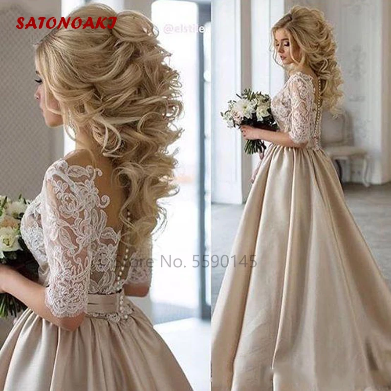 Винтажное свадебное платье-трапеция с длинным рукавом, атласное кружевное платье цвета шампанского, свадебное платье, свадебное платье, платья онлайн, изготовление на заказ
