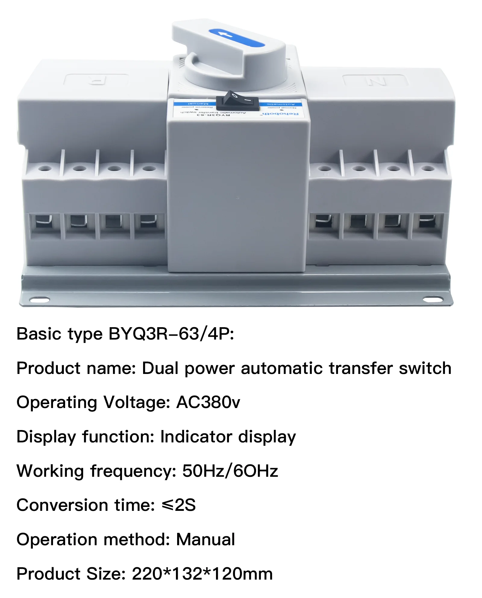 1. ПрименениеBYQ3R-это терминальное устройство автоматической передачи. Она подходит для 3 фазы 4 провода (или 1 Фаза 1 провод) с двумя электросети переменного тока в переменного тока, 50/60 Гц, номинальное напряжение 400V/230V и номинальный ток до 63A. Когда одна мощность идет неправильно (только проверьте нормальную фазу напряжения и резервную фазу напряжения A, только тест потери напряжения или фазы потери), он автоматически подключает один или несколько цепей нагрузки от одной мощности к другой мощности автоматически, чтобы обеспечить нормальный источник питания цепей нагрузки.