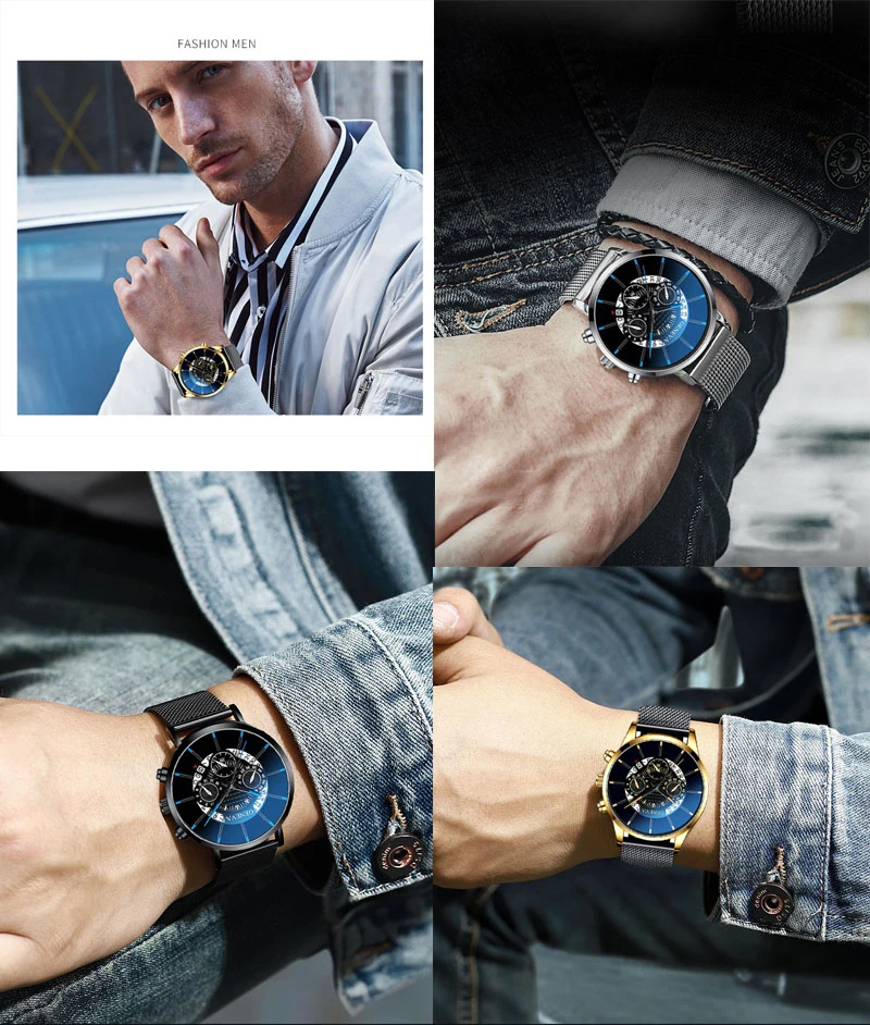 Мужские часы 2020, модные ультратонкие часы с отверстием, мужские деловые кварцевые часы с сетчатым ремешком из нержавеющей стали, мужские часы