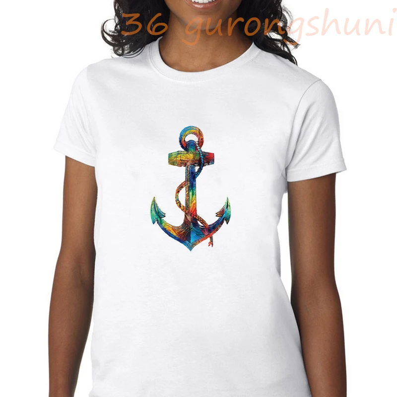 Футболка с рисунком якоря корабля, футболка с пиратской лодкой, белый летний топ, женская футболка, Корейская одежда, женская одежда, принт коровы белая футболки женские