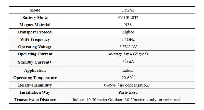 Обзор:Наш датчик двери очень работает! Его легко установить и использовать после подключения к концентратору ZigBee! Это пульт дистанционного управления Tuya APP. Приведет вас к умной жизни!Особенности:【Наслаждайтесь своей умной жизнью 】после подключения с ZigBee Hub, когда вы выходите из дома, он будет толкать вам сообщение уведомления, когда дверь/Окно открывается, так что вы можете обнаружить нарушителя во времени.【APP Remote control】загрузите приложение «Tuya/Smart Life» из GooglePlay или APP Store, чтобы добавить устройство для обнаружения состояния вашей двери/окна. Домашняя безопасность в вашей руке постоянно.【Share контроль и история записей tracking】вы можете поделиться устройством с семьей и отслеживать историю деятельности датчика.【Легко установить 】 Просто прикрепите одну часть к вашей двери или окну и прикрепите другую часть к дверной или оконной раме с помощью двусторонней клейкой ленты всего за несколько шагов.【Ультра низкое энергопотребление 】супер низкое энергопотребление, оповещение о низком заряде батареи. Время работы от аккумулятора: 1 год (25 раз/день); 2 года (10 раз/день). Нормальный WIFI датчик для двери батареи может работать только около 6 месяцев.Характеристики:Два состояния: открытый и закрытыйИсточник питания: 1 * CR2032 (в комплекте)Ток в режиме ожидания: ≤ 5μAТок сигнала тревоги: ≤ 80 мАВремя работы в режиме ожидания: 12-24monthsРасстояние сигнализации: ≥ 15 ммПротокол: ZigBeeПриложение: SmartLife/TuyaМатериал: Улучшенный АБС-пластикРабочая температура: -20 ℃ ~ 60 ℃Рабочая влажность: 20% ~ 85%Размер: основной корпус (Д * Ш * В): 40*25*10 ммПервый корпус (Д * Ш * В): 22*7*10 ммИнформация о посылка:Посылка с размерами: подходящая. 4,5*2,5*1,5 см/1,7*0,98 * 0.59inВес посылка: подходит. 50 г/1,76 унцийПосылка:1 * Беспроводной датчик двери/окна1 * Руководство пользователя (на английском языке)1 * Набор наклеек