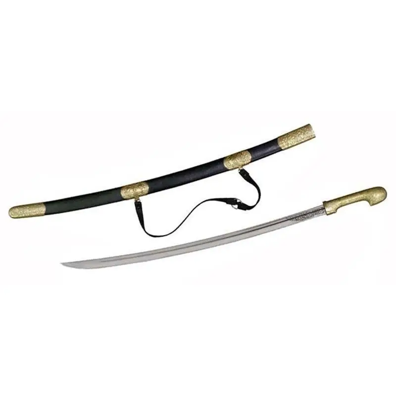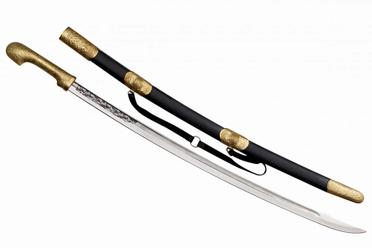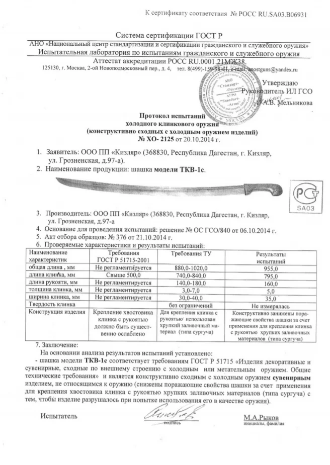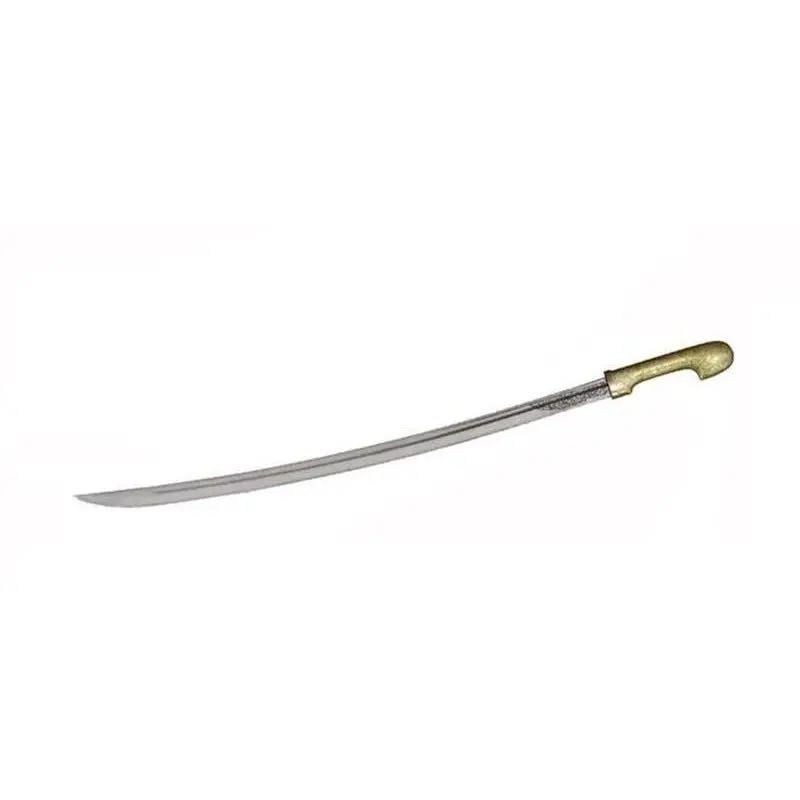 Название модели - ККВ Общая длина (мм) - 915 Длина клинка (мм) - 750 Толщина клинка (мм) - 3,5 Материал рукояти - латунь Форма клинка - изогнутая, с долами Сталь - нержавеющая сталь Клинок - полированный Конструкция - соединение рукоятки с хвостовиком с помощью заливки сургучом Спуски - притупленная Чехол/ ножны - латунный корпус, кожаный ремешок для ношения на поясе, не является холодным оружием, имеется сертификат МВД, товар предназначен для туризма и спорта