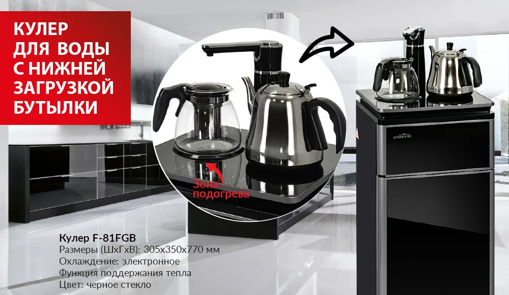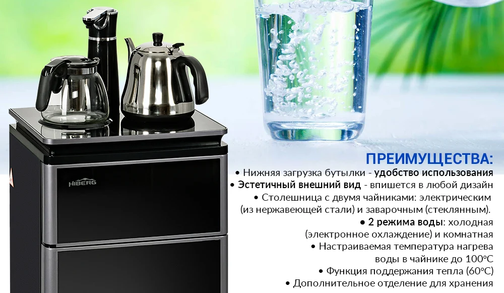 Кулер диспенсер, чайный столик HIBERG F-81FGB нижняя загрузка бутылки стеклянный фасад