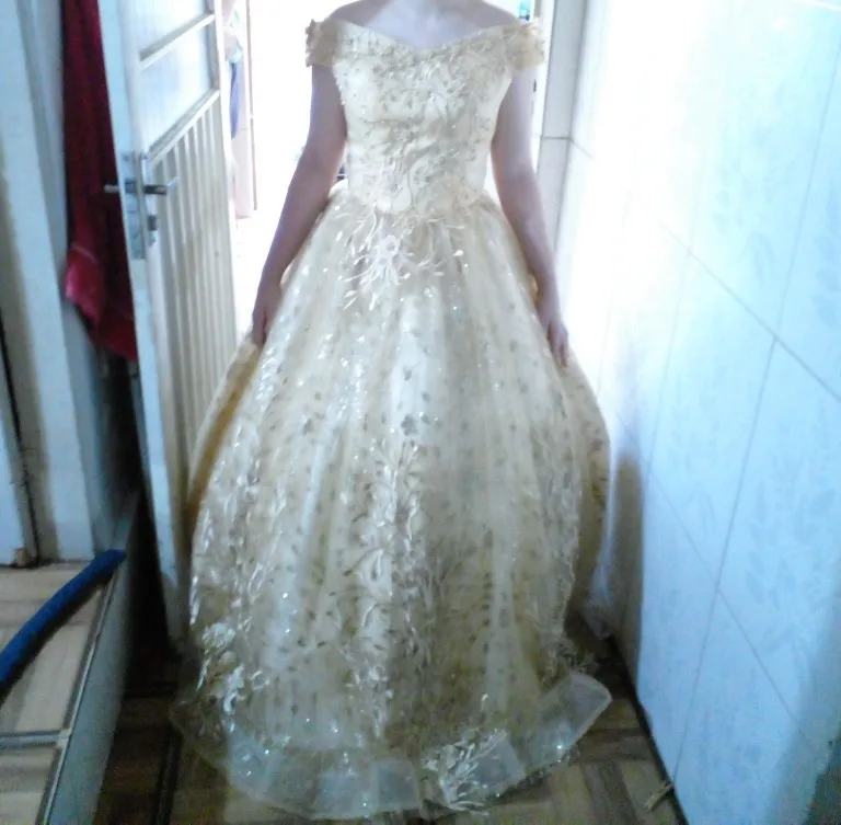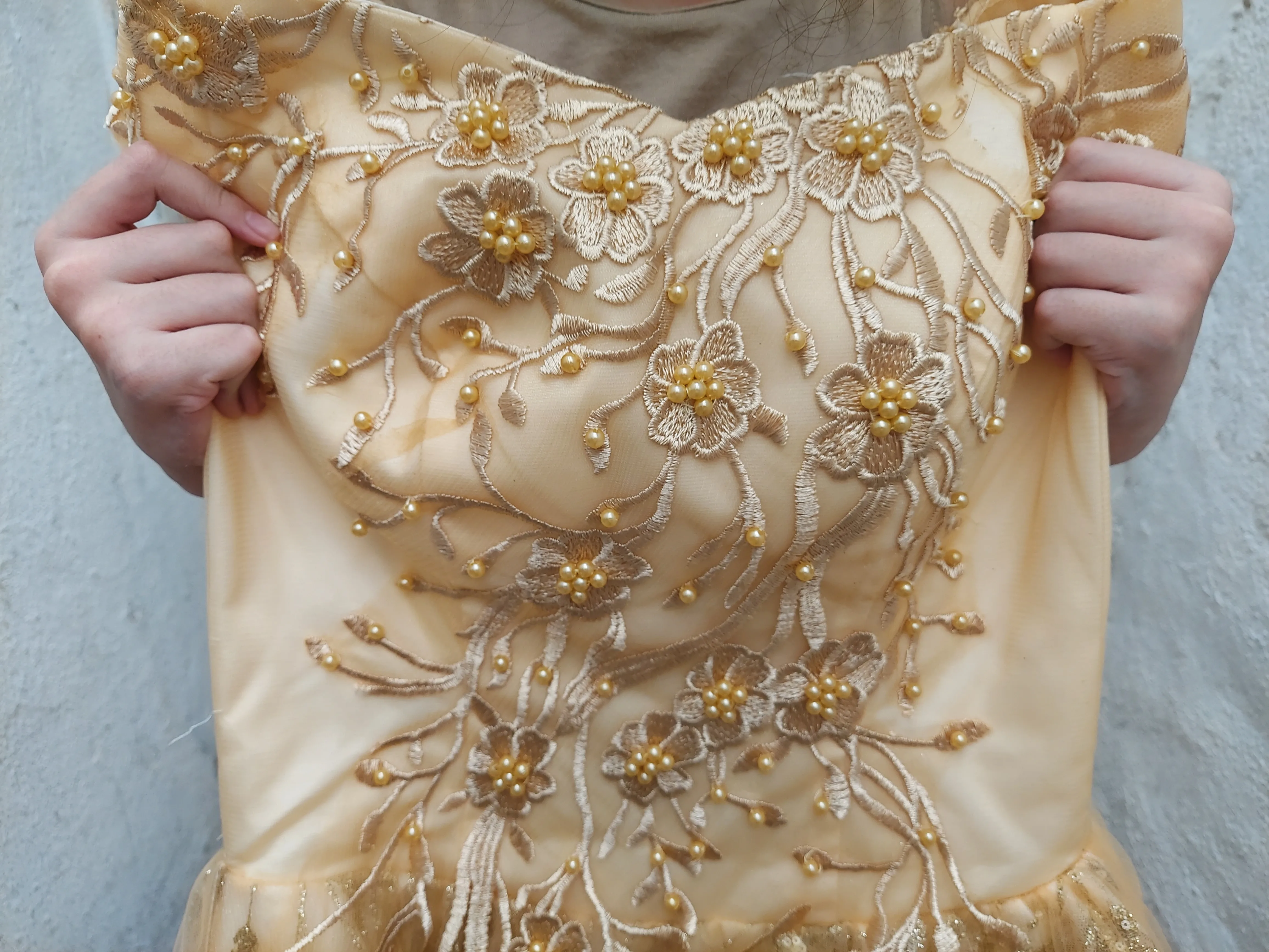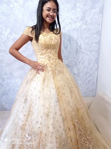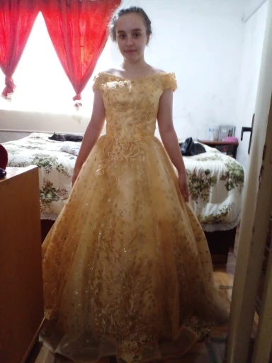 Неплохое платье за эти деньги. На рост 163 оказалось длинновато, обрезала, из этой ткани сделала маленькие рукавчики-крылышки. Под мышками было немного странно скроено, немного перешила, буквально несколько см. К платью прилагался кринолин, но совсем небольшой. Я надевала свой, более объемный. Все эти блёстки сыпятся, но ткань все равно продолжает искриться. За это сняла звезду. Но в целом платье рекомендую. В нем Я была Королевой бала !