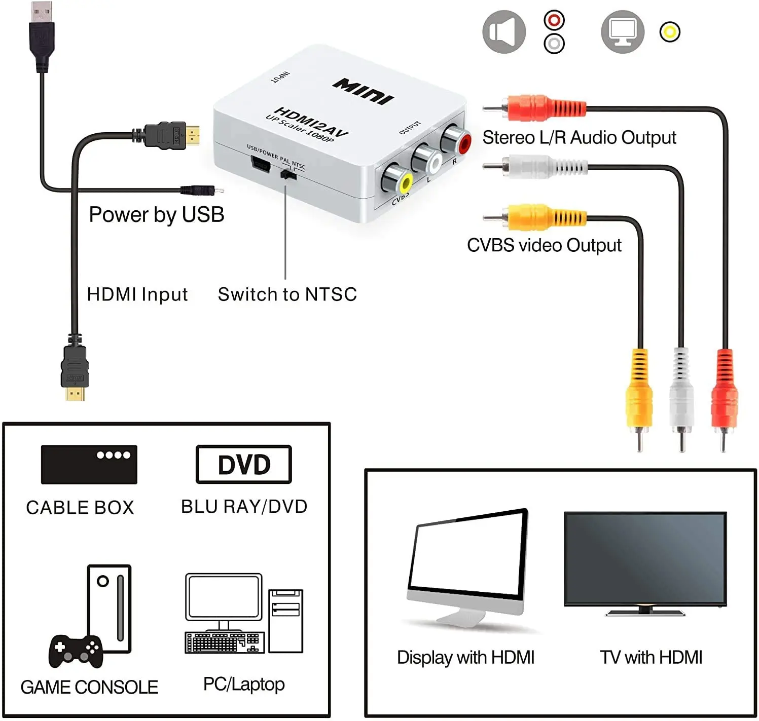 Мини-конвертер HDMI в AV HDMI2AV 1080P HDMI в CVBS + L + R HD видео конвертер адаптер Кабельная коробка