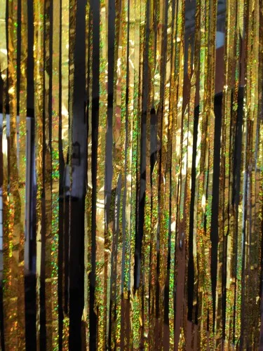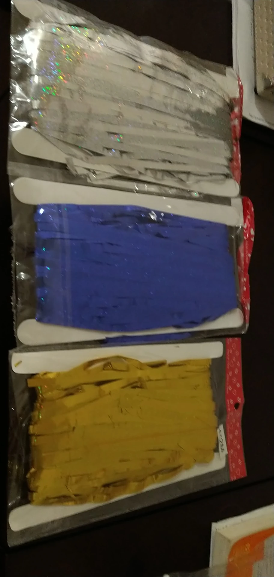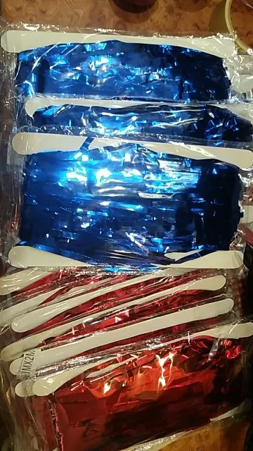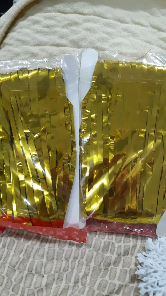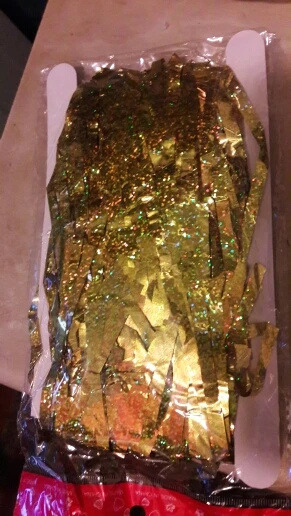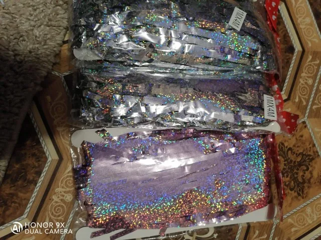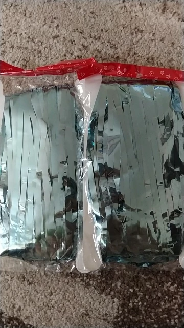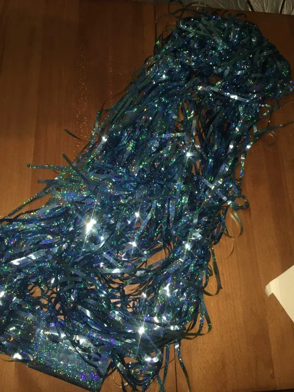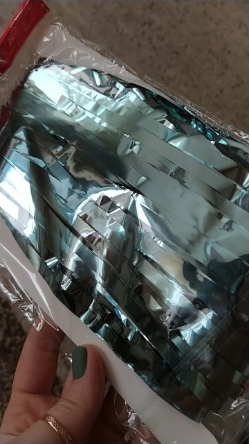 Очень боялась что прийдет обычный елочный дождик, но нет. Ленты намного шире и сам материал более прочный. Цвет точно такое же как на фото продавца(на моих цветопередача другая). В один слой оооочень мало, нужно миннимум 2.
