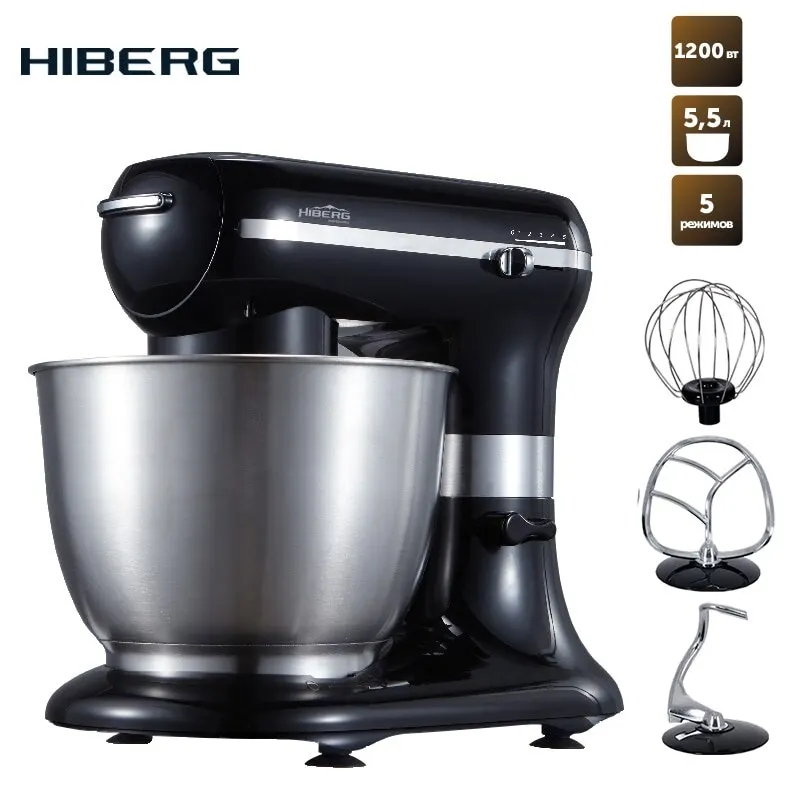 Миксер планетарный HIBERG MP 1255 B 1200 Вт чаша 5.5 л из нержавеющей стали 5 скоростей крюк лопатка венчик крышка