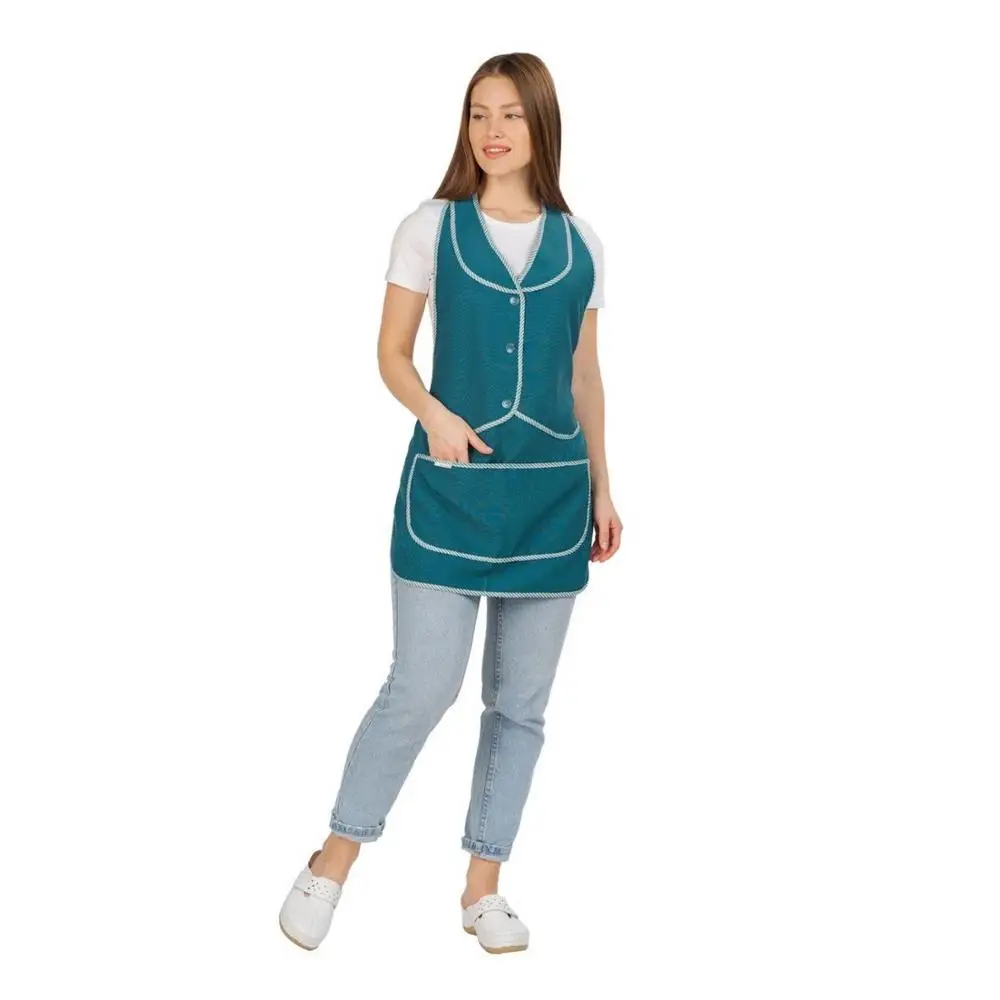 Фартук укороченный без спинки. Верхняя отрезная часть полочки с воротником, имитирующая жилет с застежкой на три пуговицы, плавно переходит в широкую бретель на шее. В нижней части полочки расположены два вместительных боковых кармана. Объем фартука регулируется завязками-поясами, все срезы фартука обработаны кантом из капроновой ткани. Фартук предназначен для защиты от общепроизводственных загрязнений.