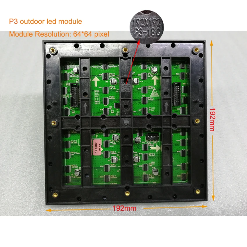 Шаг: 3 мм Плотность (точка/кв. М): 111111 Светодиодный инкапсуляции: SMD1921 Размер модуля (мм): 192*192 Разрешение модуля (пиксель): 64*64 Метод привода: 1/16 сканирования Яркость (cd/кв. М): 6500 Серый сканер: ≥ 4096 Угол обзора: 140/140 Рабочее напряжение: 5 в пост. Тока Срок службы: 100000 часов Уровень IP: IP65 Гарантия: 3 года Система управления: LINSN/ZDEC/DBSTAR/NOVA/COLORLIGHT