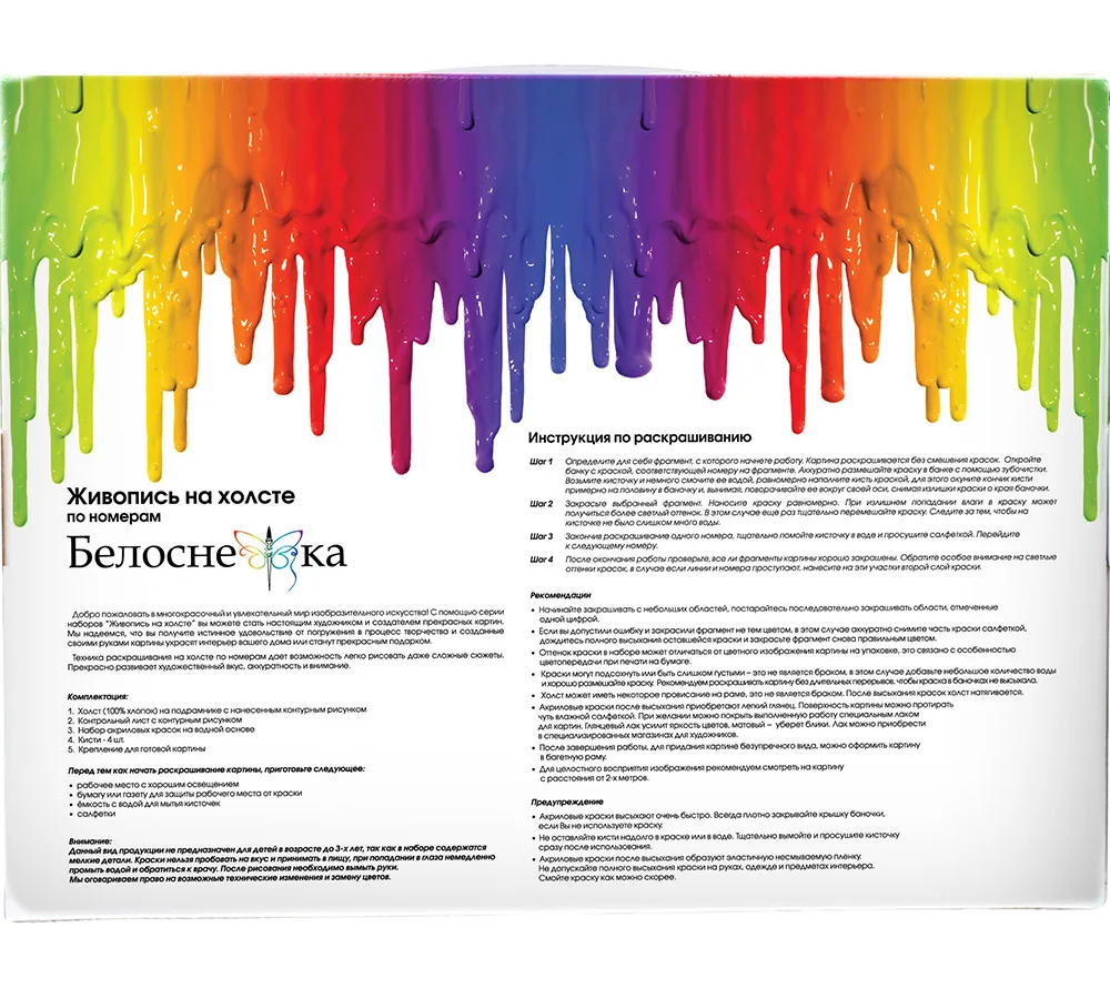 Набор для рисования по номерам: Полуденный зной Раскраски по номерам или как их еще называют раскраски по цифрам — это отличный отдых и раскрытие творческого потенциала. С помощью наборов “Живопись на холсте” от нашей компании “Белоснежка”, вы можете стать настоящим художником и создателем прекрасных картин. Мы надеемся, что Вы получите истинное удовольствие от погружения в процесс творчества и созданные вами картины украсят интерьер дома или станут прекрасным подарком. Техника раскрашивания по номерам дает возможность рисовать даже сложные сюжеты. Конечно, эта работа требует внимания и аккуратности, но результат станет отличной наградой. Раскрашивание по номерам развивает художественный вкус, аккуратность и усидчивость. Набор предназначен для детей и взрослых. Комплектация: Холст на подрамнике с нанесенным рисунком Контрольный лист с нанесенной схемой Набор акриловых красок Кисти с искусственным ворсом – 4 шт. Крепление для готовой картины Листовка о художнике Характеристики: Художник - Юлия Неприятель Размер - 30*40 см. Серия – лошади, животные Количество цветов - 29 Упаковка - картонная коробка Торговая марка - Белоснежка Страна производства - Китай