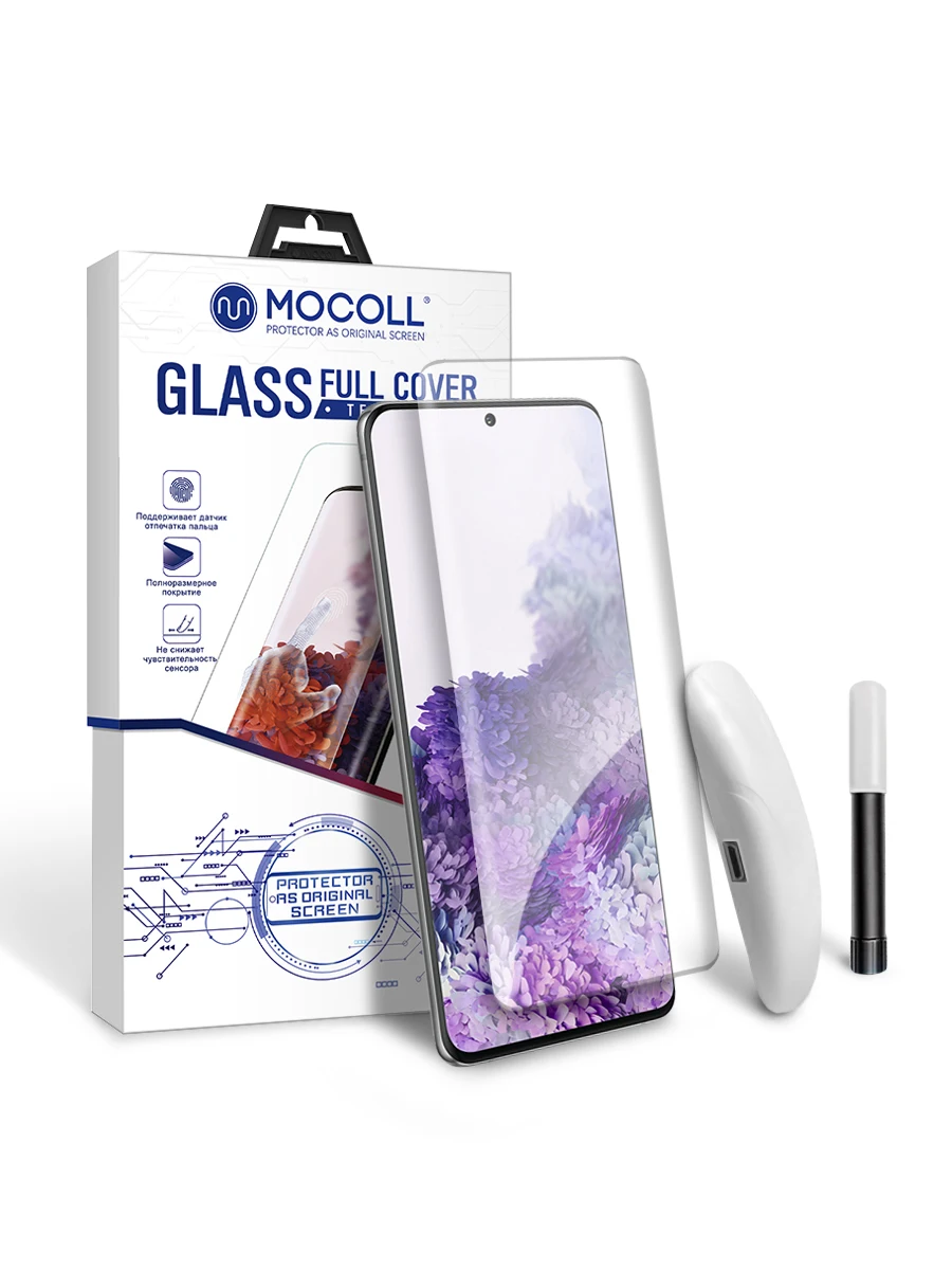Защитное стекло MOCOLL прозрачное 3D с УФ-клеем - Samsung S20 Plus (Platinum)Основа – японское стекло Asahi твердостью 9H. Его прочность и надежность для защиты экрана подтверждена сертификатами качества.