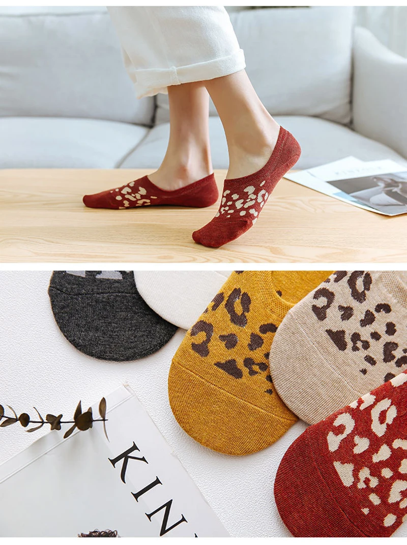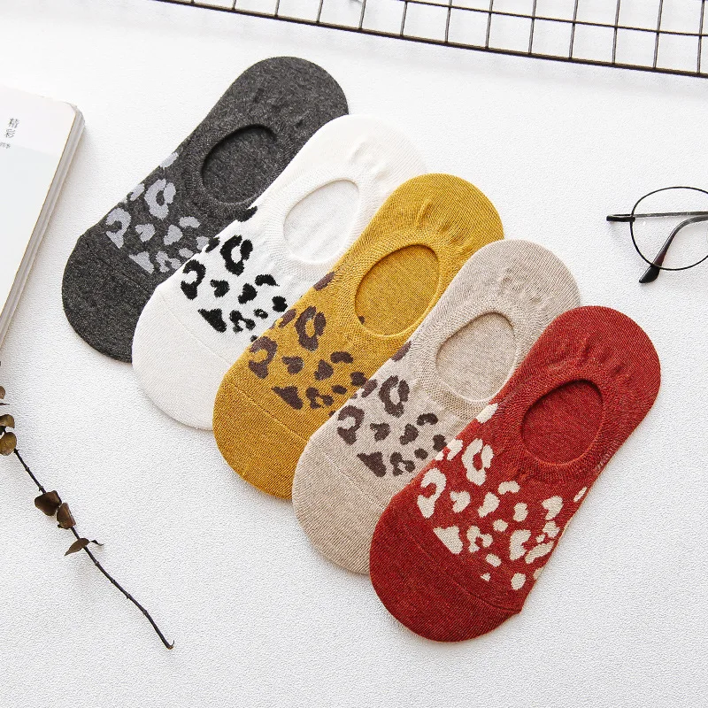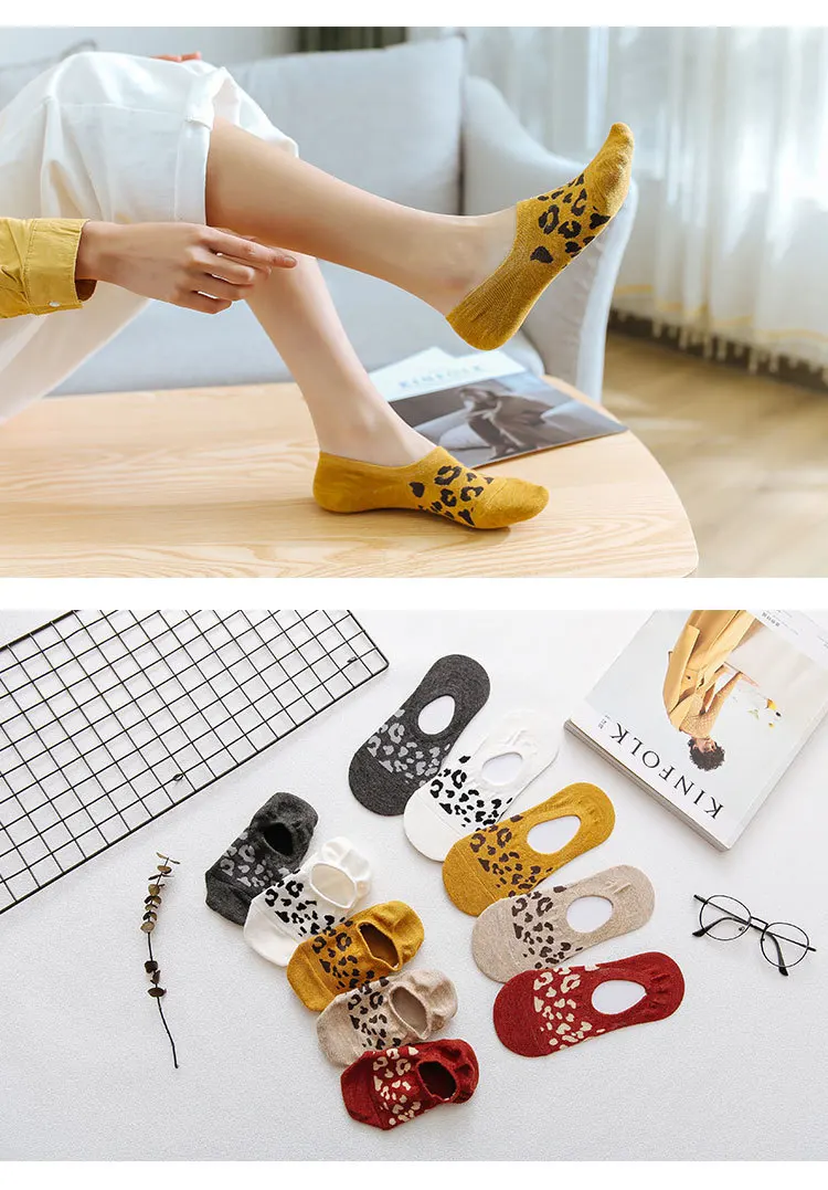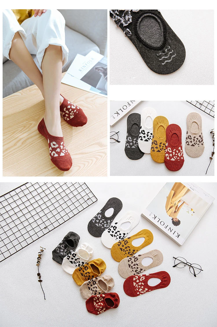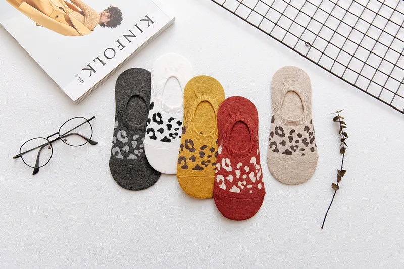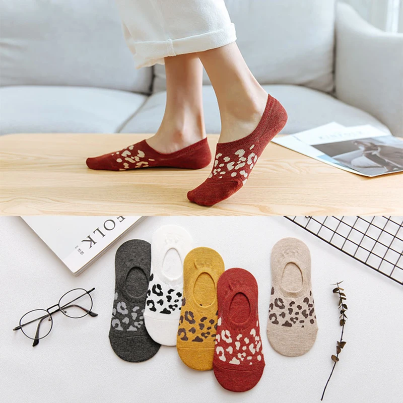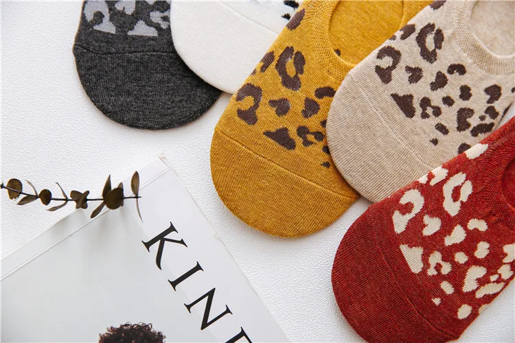 5 пар, женские хлопковые невидимые Нескользящие силиконовые носки-тапочки с леопардовым принтом