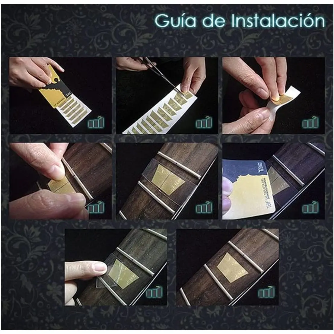 Особенности: 1. Наклейки изготовлены из высококачественных и долговечных профессиональных материалов. 2. Они имеют минимальную толщину, поэтому не влияют на время воспроизведения инструмента. 3. Они помещаются путем переноса, легко устанавливается и снимается быстро. 4. Подходит для различных типов гитары 5. Сделано в Испании (Европейский союз)