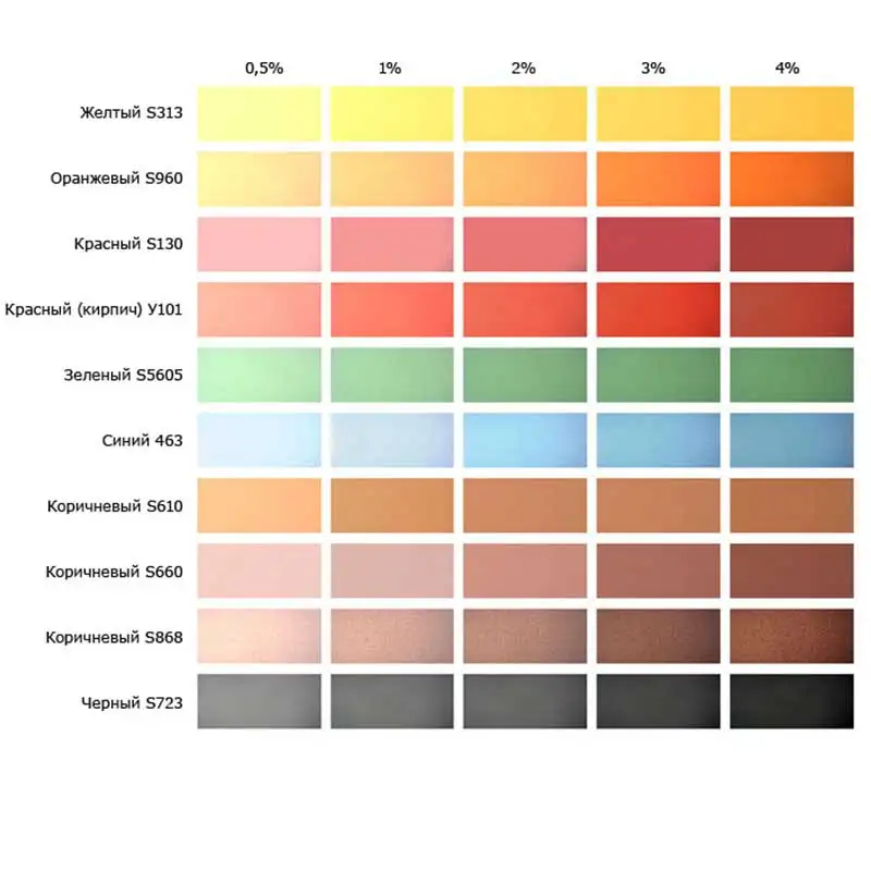 Кроме черного цвета, вы найдете у нас все основные цвета. Пигменты разных цветов можно смешивать между собой и существенно расширить палитру. Сферы применения: Производство силикатного кирпича; Производство цветного бетона; Производство тротуарной плитки; Производство искусственного камня; Производство пластмасс; Производство спортивных покрытий; Производство ЛКМ; Производство полимер-песчаной черепицы; Железноокисные пигменты используются для придания различных цветов бетонным и растворным смесям, кирпича силикатного, изделия из гипса, мрамора искусственного, бетонной черепицы, элементов благоустройства территорий и малой садовой архитектуры. Ориентировочный расход пигмента в бетонном растворе, интенсивность окрашивания: Расход пигмента для бетона на 50 кг цемента: пастельные тона, особо светлые тона 0.5 - 1.0 кг. средняя 1.5 - 2.0 кг. насыщенная (высокая) 2.5 - 3.0 кг. Рекомендуемая дозировка - максимум 6% от массы вяжущего (цемента, гипса). При превышении дозировки может уменьшится прочность готовых изделий. Окончательный цвет изделия зависит от исходного цвета песка и цемента. Чем светлее и белее оттенок песка и цемента, тем насыщенней будет цвет готового изделия. Желательно использовать белый цемент.