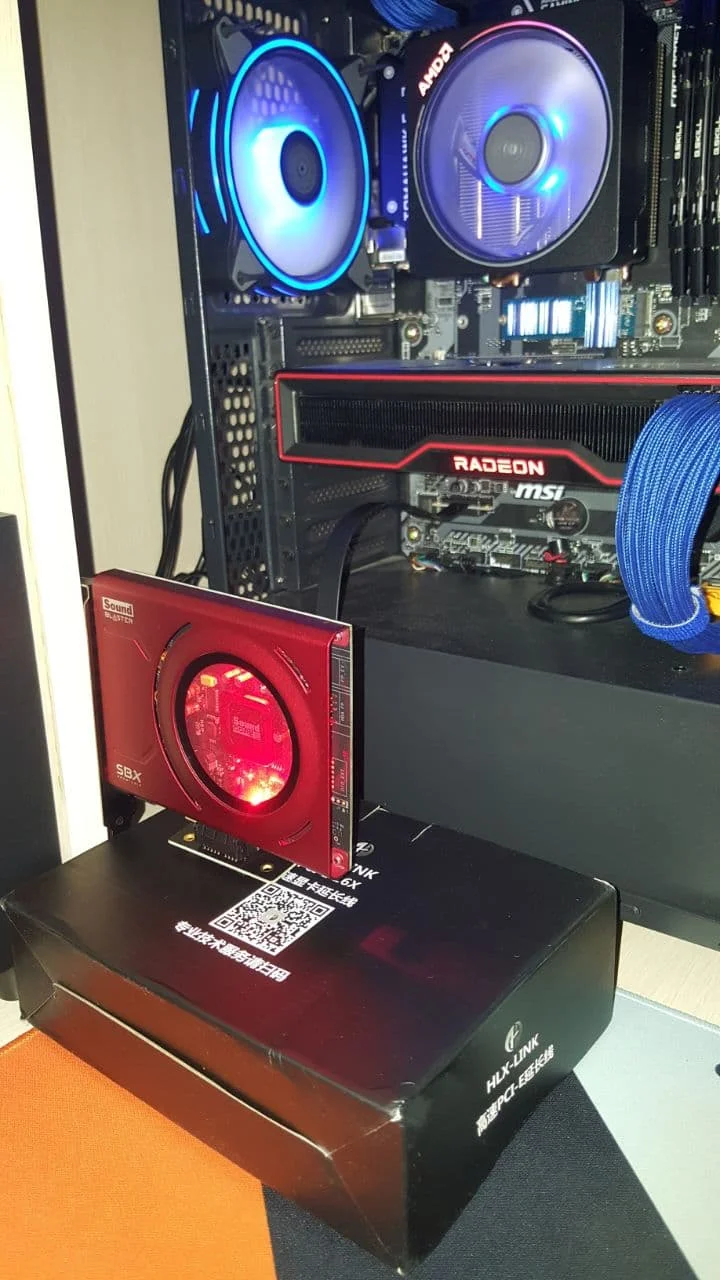 отлично работает с звуковой картой Асус Стрикс не какой разницы что в системной плате что через переходник