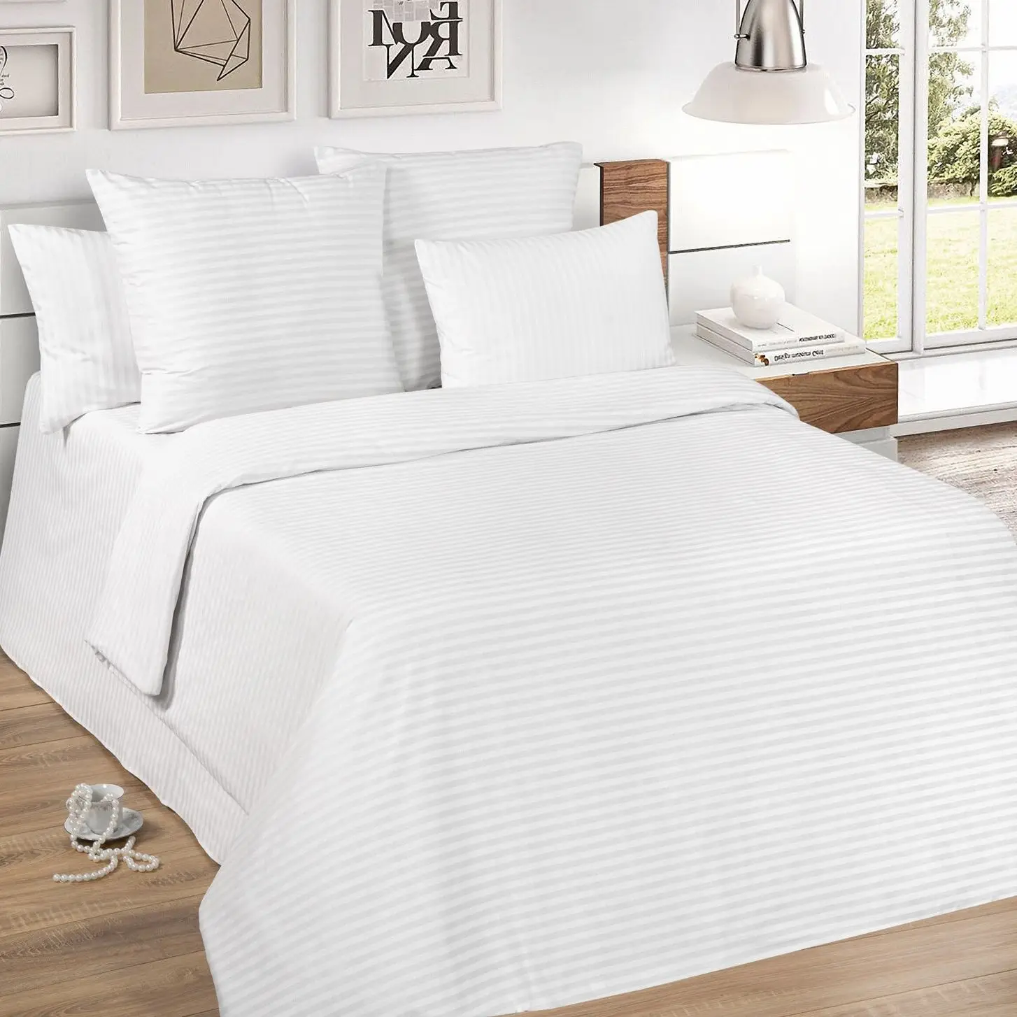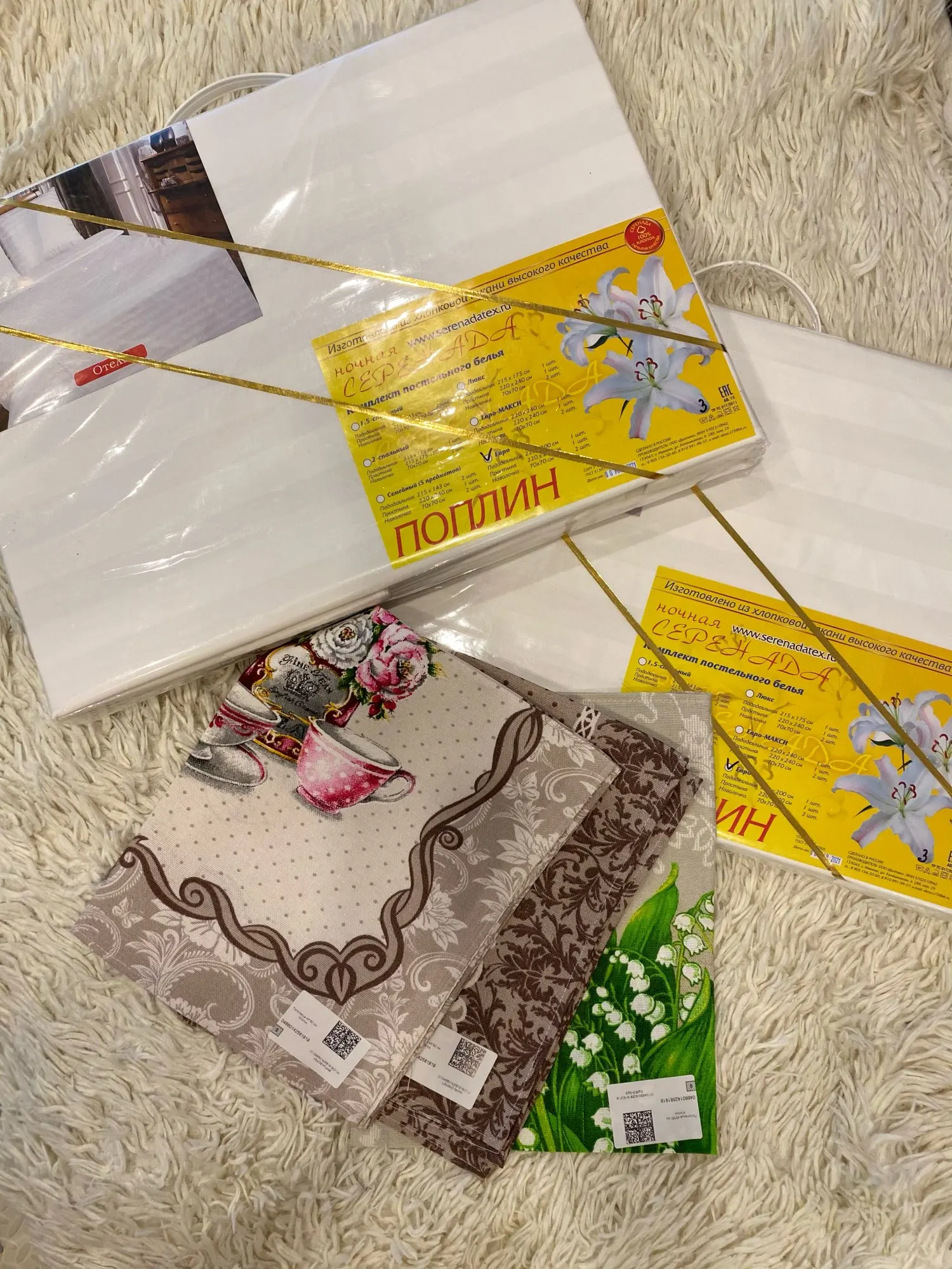 Бельё белое из поплина, поэтому пододеяльники и наволочки немного просвечивают. Но очень хорошего качества, хорошие плотные швы. Размеры совпадают, радует большое ассортимент размеров на выбор. В семейном комплекте 2 наволочки и 2 пододеяльника, простыня. За такую цену, конечно, нигде не купишь в городе) Выбирала доставку из России, в СПб пришло за неделю, посылка отслеживает тут и в приложении Почта России