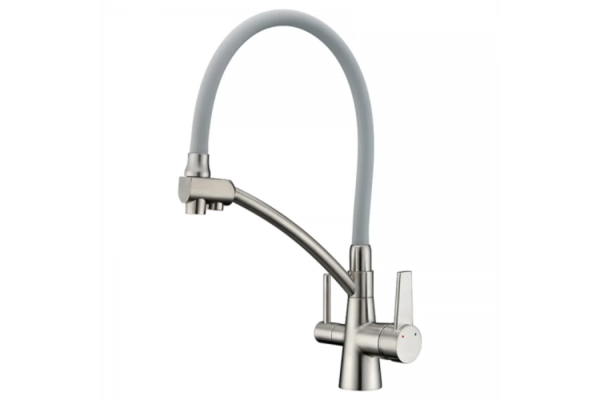 Однорычажный смеситель с подключением фильтра для воды для кухонной мойки с гибким силиконовым изливом в сером цвете G4398 GAPPO (ГАППО) с гайкой из нержавеющей стали. Излив гибкий. Картридж испанский Sedal Ф35 мм. Металлическая рукоятка. Аэратор. Гибкая подводка на 1/2 дюйма (длина 500 мм).