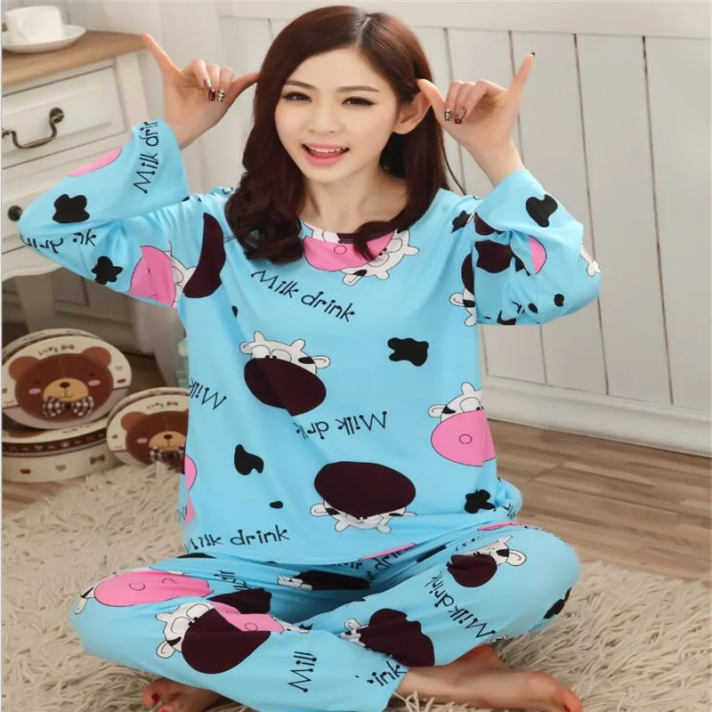 Женская пижама, комплект из 2 предметов, женские пижамные комплекты с длинным рукавом, одежда для сна с принтом молочной коровы, длинные штаны, женская ночная одежда
