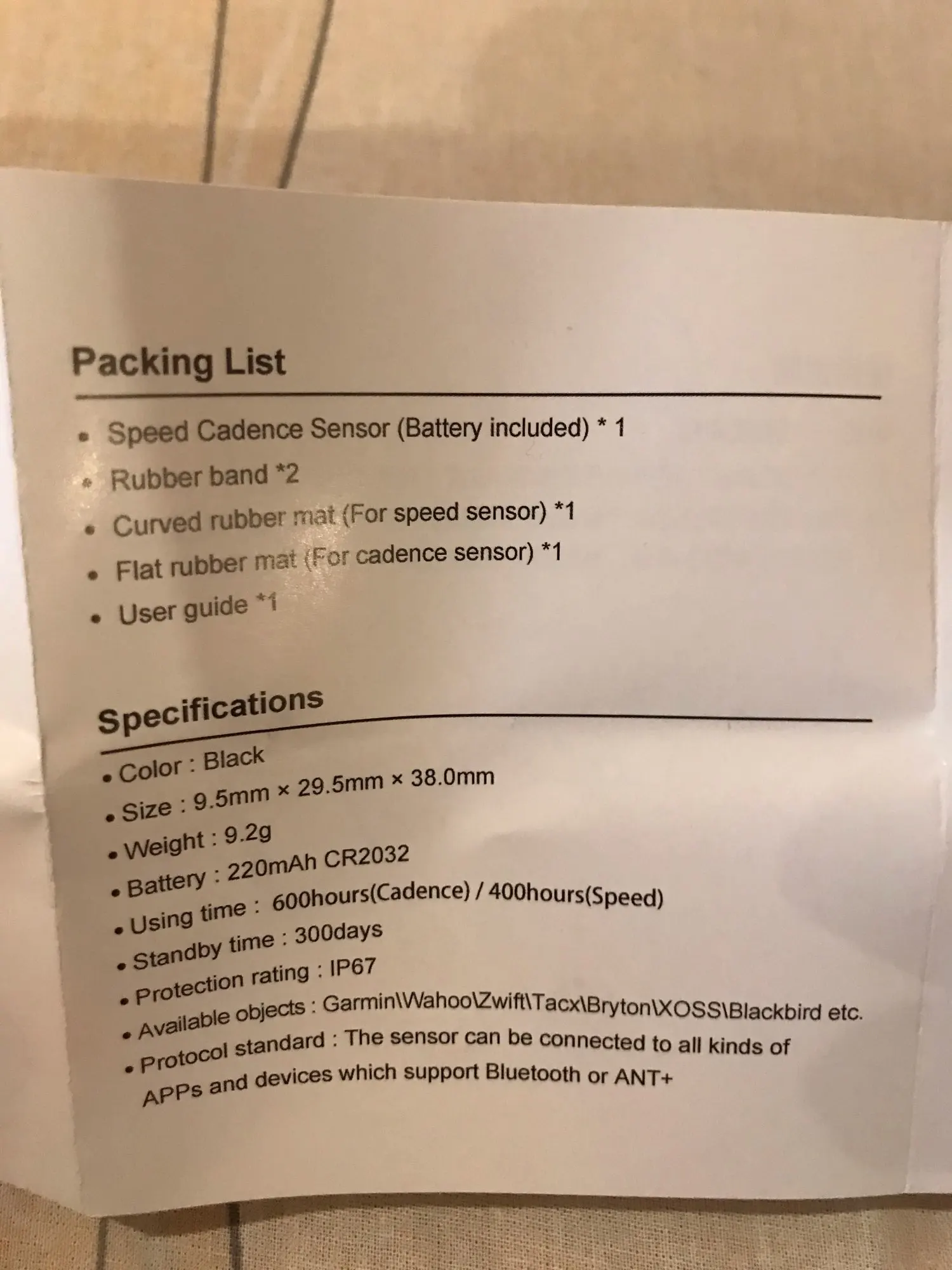Пришло во время. Отправлено быстро. Датчик подключился к велокомпьютеру Garmin без проблем. Использую на велостанке в режиме определения каденса. Инструкция на англ весьма информативна-в описании указано что необходимо удалить защитную пленку между контактом и батарейкой (входит в комплект), так и оказалось. Очень конкурентноспособный датчик и комплектация для такой цены. Рекомендую!