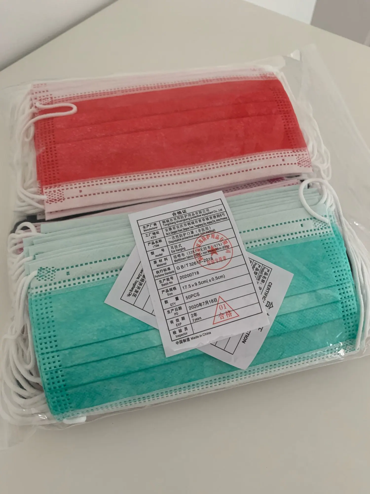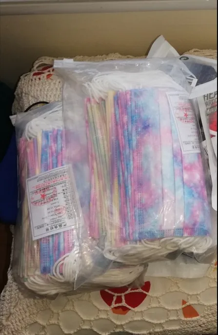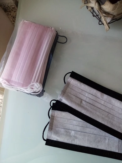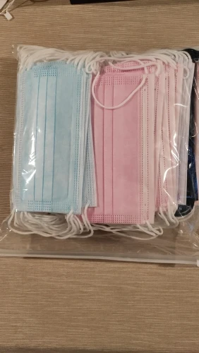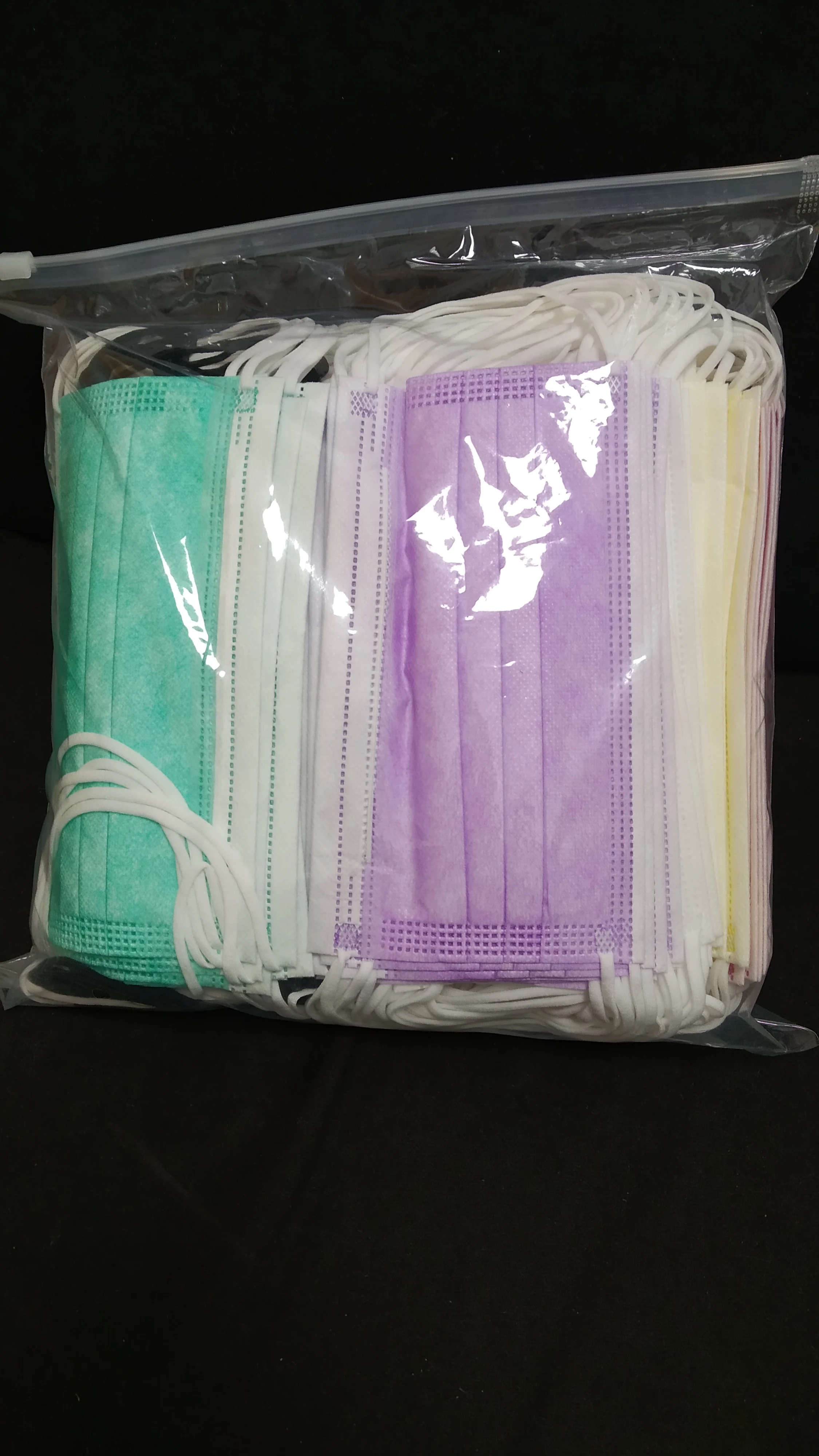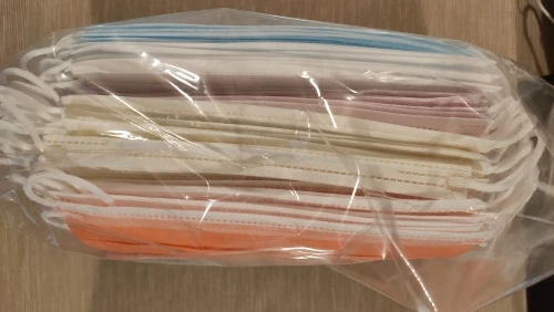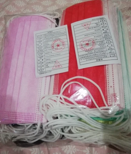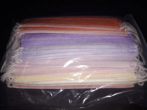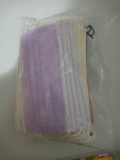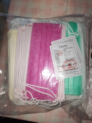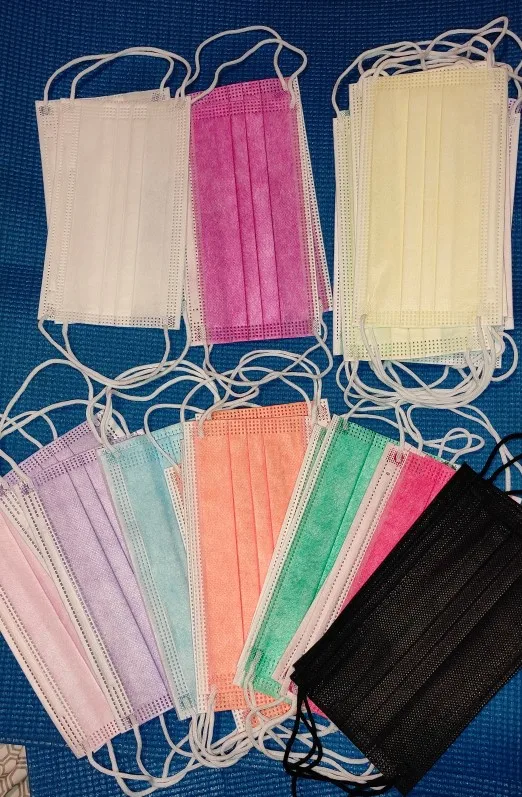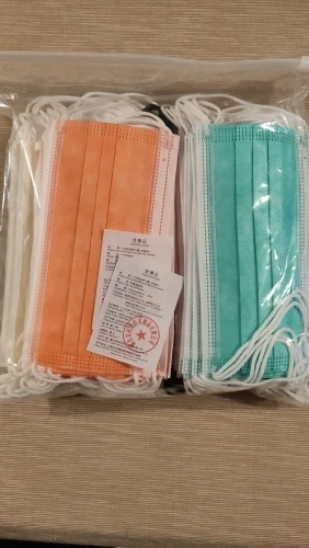 35 дней в Германию. 3 слоя, реальный слой фильтра внутри. Внешний слой дешевый, но хорошо. 100 масок, 10 цветов, один пакет. Зажим для носа из пластика, немного слабый.