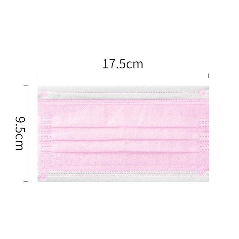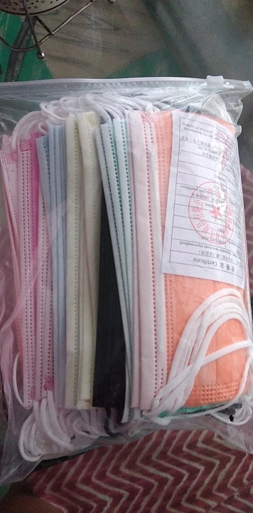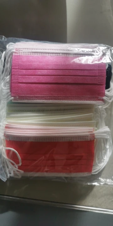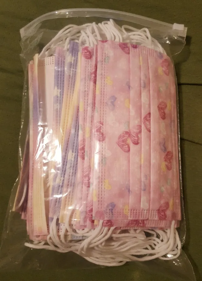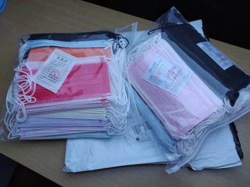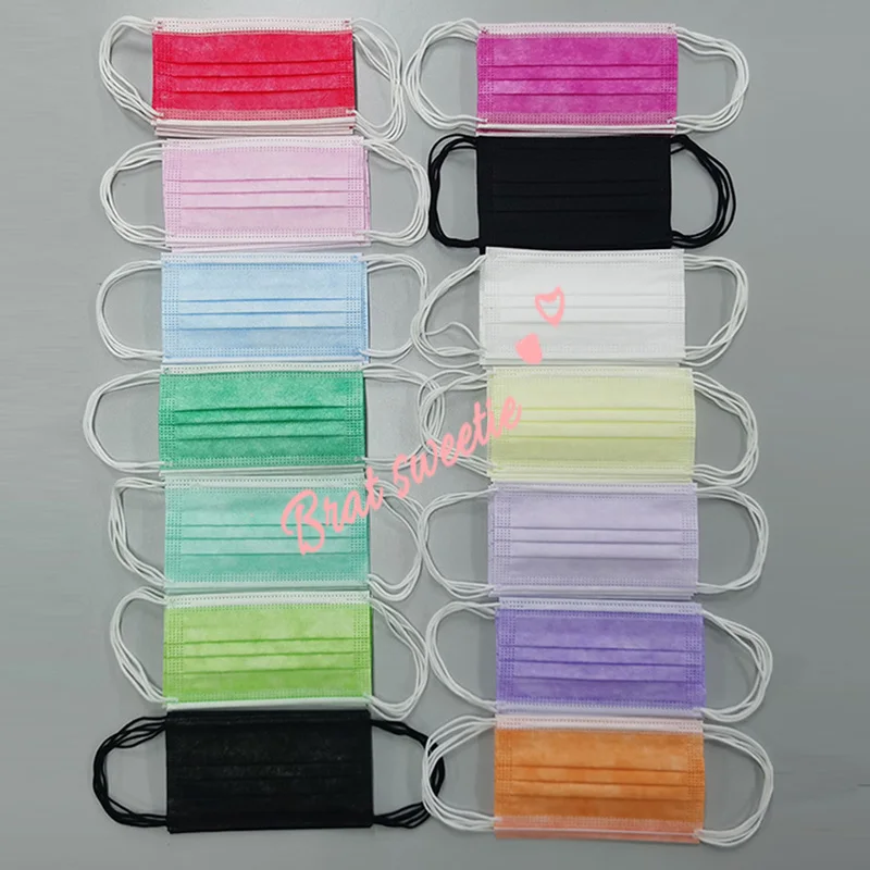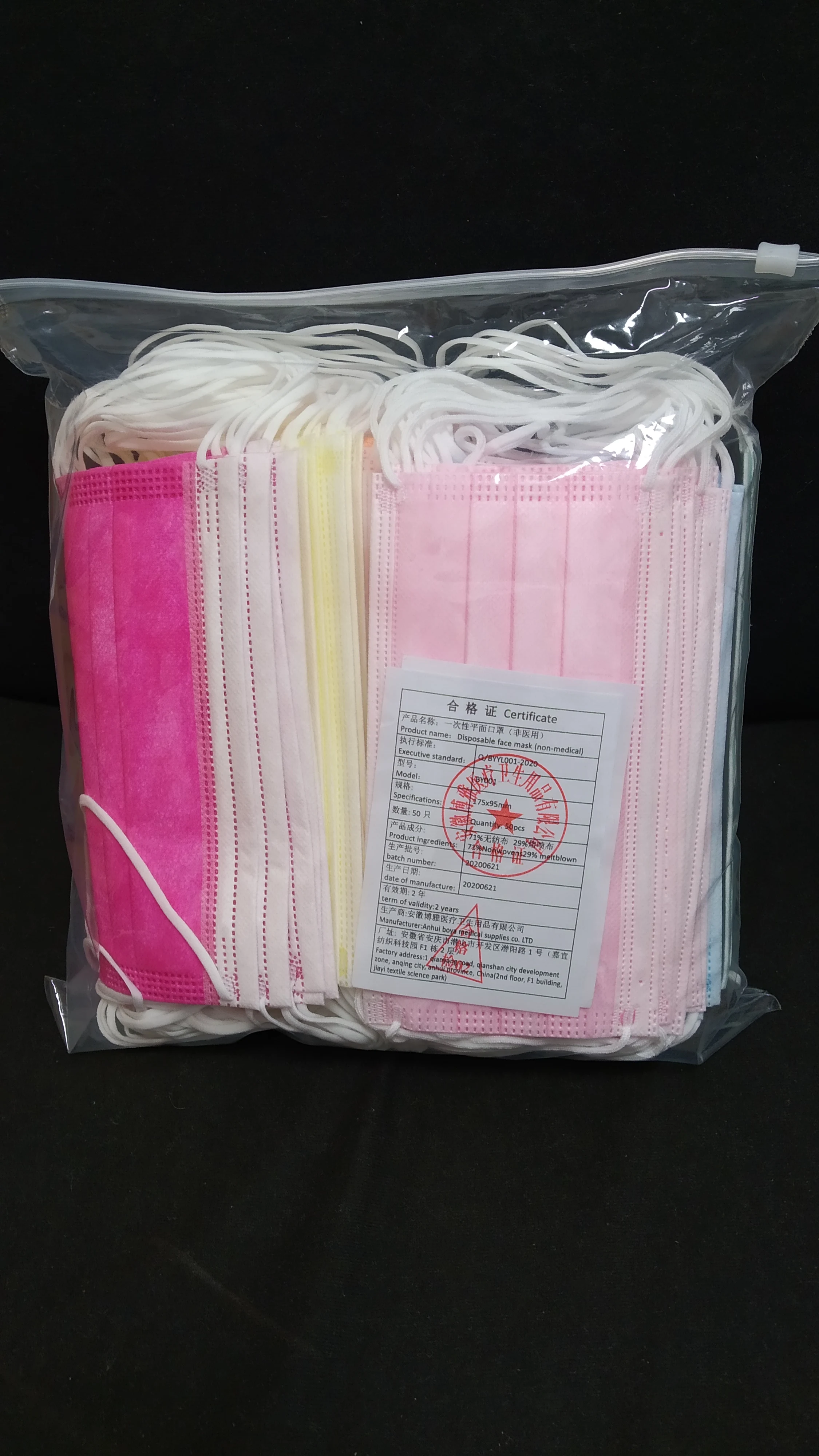 35 дней в Германию. 3 слоя, реальный слой фильтра внутри. Внешний слой дешевый, но хорошо. 100 масок, 10 цветов, один пакет. Зажим для носа из пластика, немного слабый.