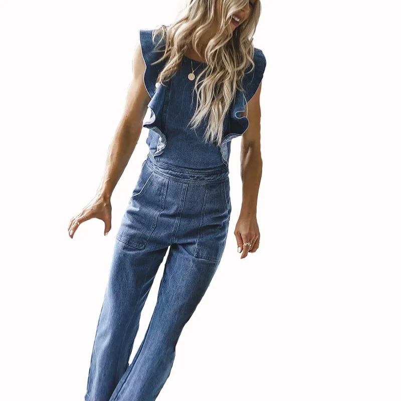 Синий джинсовый комбинезон, комбинезон, женский комбинезон с оборками и открытой спиной, лето 2020, новинка, Женские повседневные модные штаны, популярные джинсы