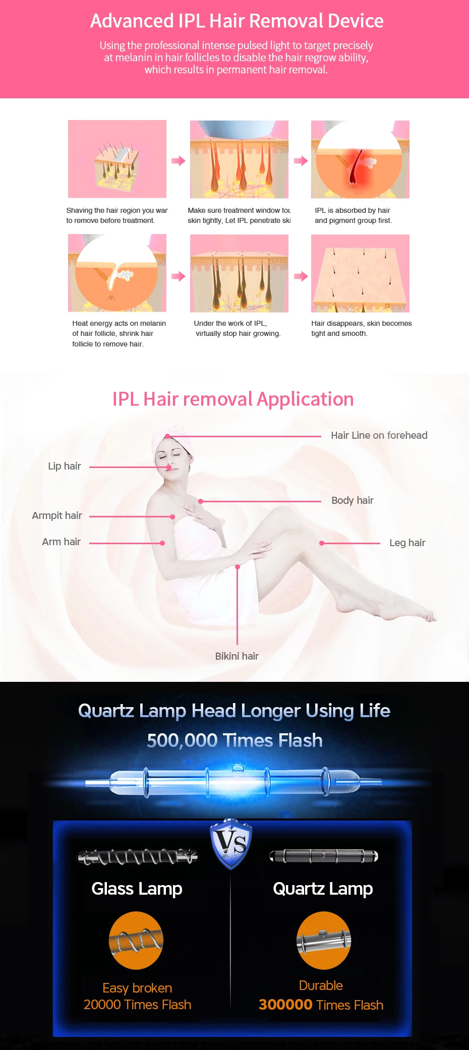 Функция охлаждения льда MLAY IPL удаление волос, с 500000 вспышками позволяют 9-11 индивидуальным сделать удаление волос всего тела. Домашнее лазерное удаление волос интегрировано с механизмом охлаждения ледяного компресса можно использовать одновременно при обработке. Он может поддерживать температуру поверхности кожи в пределах 32-41 ℉ и предотвращать повреждение кожи, покраснение и ожоги.