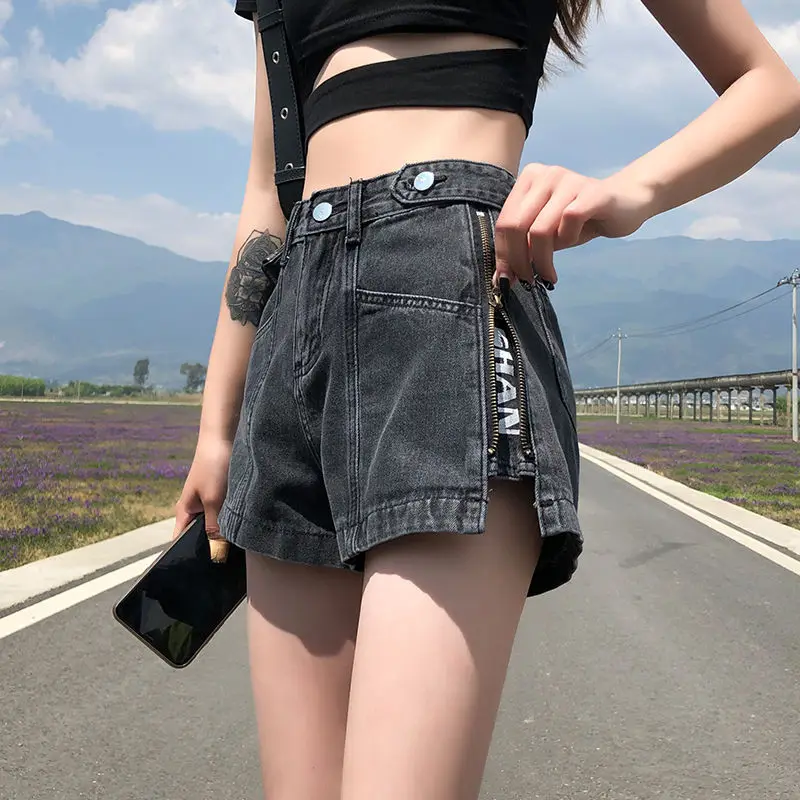 Шорты женские летние джинсовые с высокой талией, на молнии, с буквенным принтом, на пуговицах