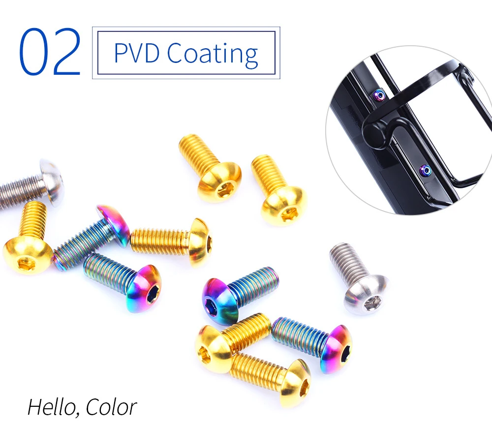 Поверхность шурупов из титанового сплава окрашена методом PVD {физического парового вкладыша BN} вакуумного нитридного покрытия, а также плотным покрытием, состоящим из олова, tlALCN и другие соединения образуются на поверхности винта для улучшения сопротивления поверхности и меньшей твердости, а также делает винты устойчивыми и долговечными, не выцветающими.