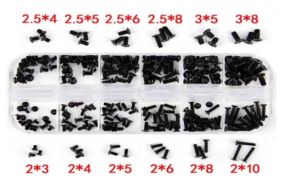 Особенности на 100% абсолютно новый, высокое качество с отличным обслуживанием клиентов. Крестовые саморезы не нужно использовать с гайками. Зубчатая резьба является саморезом, И образуется самоэкструзионный винт с треугольным зубцом в конечной точке. При вкручивании его в отверстие из пластикового металла, дерева или тонкого железа образуется внутренняя резьба. В отверстии образуется Экструзия и надежное стопорное соединение резьбы. 250 шт., набор электронных мелких винтов в ассортименте: тип Размер Количество км винт M2 * 3 20шт KM винт M2 * 4 20шт KM винт M2 * 5 20шт KM винт M2 * 6 20шт KM винт M2 * 8 20шт KM винт M2 * 10 20шт KM винт M2.5 * 4 20шт KM винт M2.5 * 5 20шт KM винт M2.5 * 6 20шт KM винт M2.5 * 8 20шт KM винт M3 * 5 20шт KM винт M3 * 8 20шт