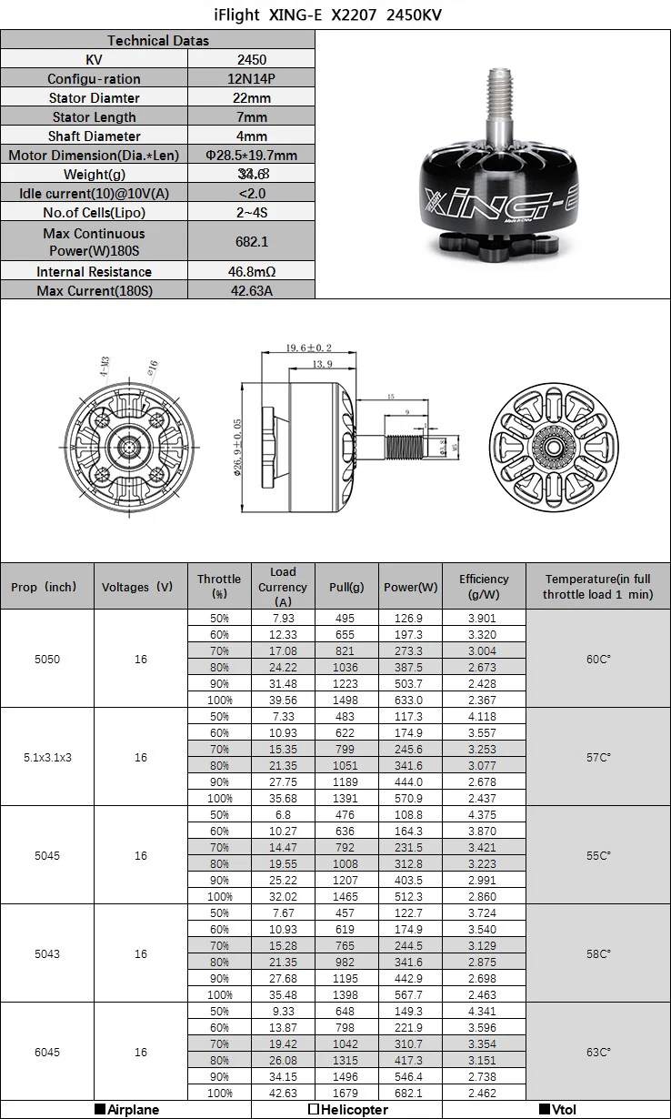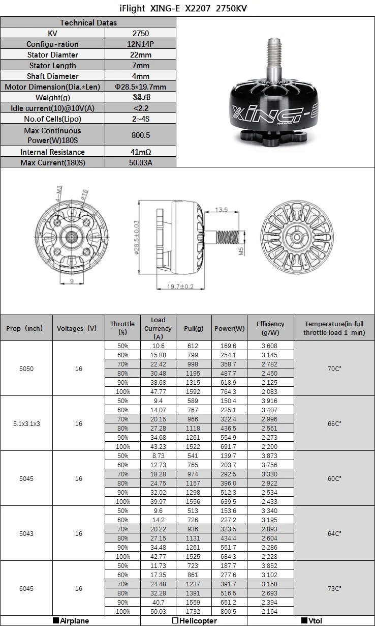 Этот 2207 Размер мотора имеет высокопрочный 4 мм стальной полый вал, одинарные обмотки для производительности, М3 вал винт, и больше 9x4x4 мм NSK подшипники.Особенности:Высокопрочный стальной вал 4 ммN52H высокотемпературные магниты, NSK подшипники16x16 мм узор отверстияОдинарная медная обмоткаКомплект болтов с шестигранной головкойТехнические характеристикиКонфигурация: 12N14PДиаметр статора: 24 ммМагниты: изогнутые N52SHРазмер подшипника: 9x4x4Диаметр вала: 4 мм/стальБазовый монтажный узор: резьба 16x16 мм M3Размер двигателя: 28,5X19,7 ммВес: 33,8 г (150 мм провода)Ток холостого хода @ 12,6 v (ввода-вывода): 1,2 AКлетки (Липо): 2-6SМаксимальный ток разрыва <10s: 35,22aМаксимальная мощность (W) 60s: 845WВнутреннее сопротивление (Rm): 81.5mΩДлина провода двигателя: 150 мм/20AWGПосылка включает в себя:4 шт XING-E мотор 2207
