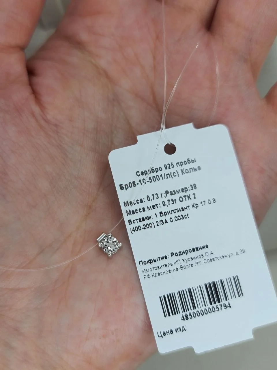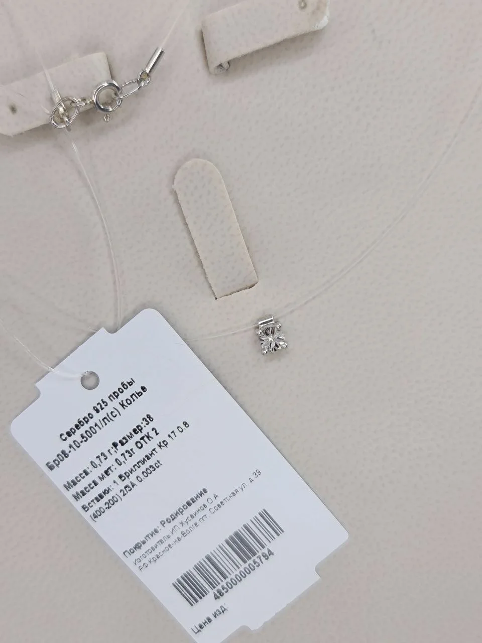0.003 карата бриллиант. Леска очень короткая, на очень тонкую шею. Смотрится дорого и стильно.